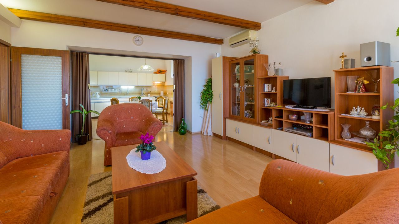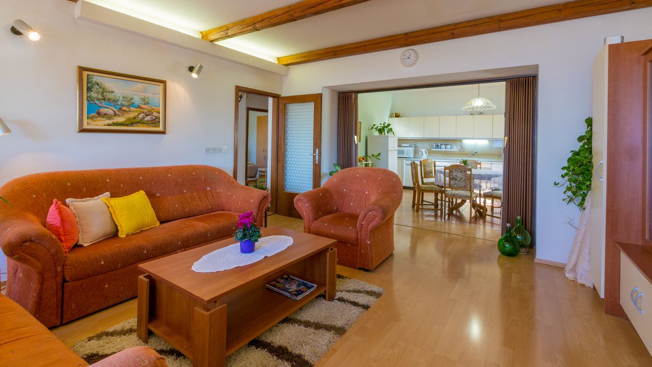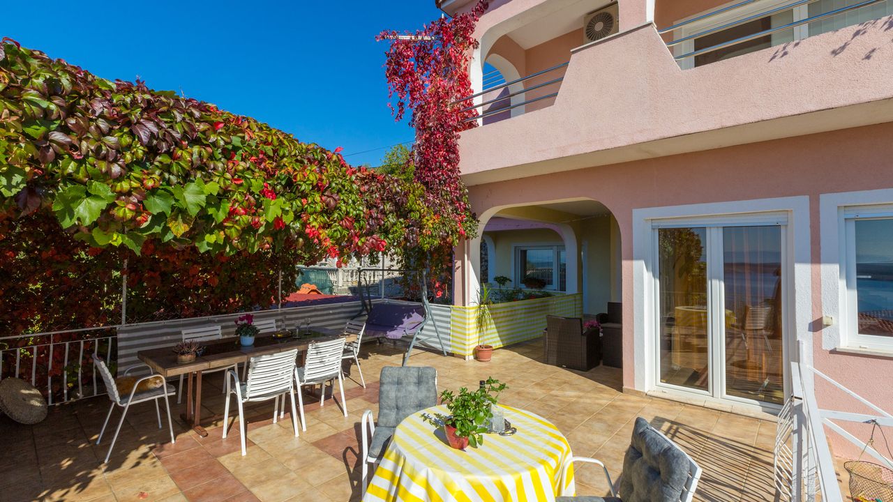 Dieses ger and auml;umige Apartment befindet sich im malerischen Fischerdorf Dramalj, einem ruhigen Vorort von Crikvenica, ideal f and uuml;r einen entspannenden Urlaub. Es erstreckt sich and uuml;ber eine Fl and auml;che von etwa 110 m and sup2; und ist perfekt f and uuml;r einen komfortablen Aufenthalt f and uuml;r bis zu sechs Personen eingerichtet. Das Apartment befindet sich im Erdgeschoss des Geb and auml;udes.Das Apartment umfasst ein ger and auml;umiges Wohnzimmer, das W and auml;rme und Gem and uuml;tlichkeit ausstrahlt, eine gro and szlig;e, voll ausgestattete K and uuml;che, drei gem and uuml;tliche Schlafzimmer mit sorgf and auml;ltig ausgew and auml;hlten Details und ein modern gestaltetes Badezimmer. Vom Apartment aus gelangt man auf eine 60 m and sup2; gro and szlig;e Terrasse, die teilweise and uuml;berdacht ist und einen herrlichen Meerblick bietet and ndash; der perfekte Ort, um den Morgenkaffee oder abendliche Entspannungsmomente zu genie and szlig;en.