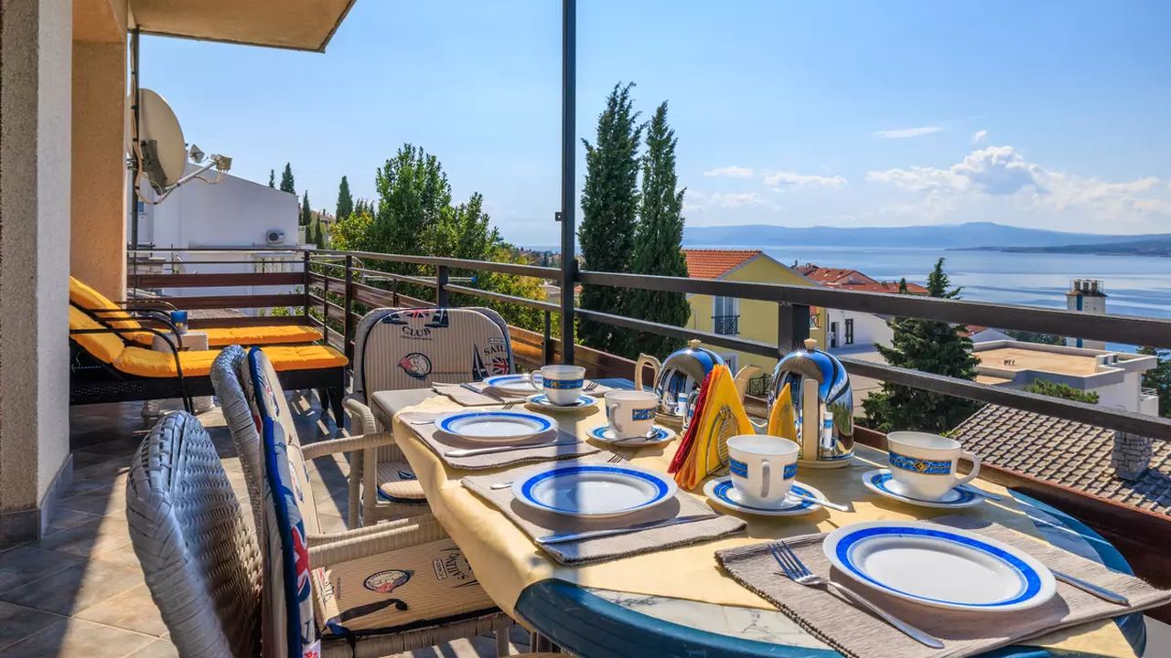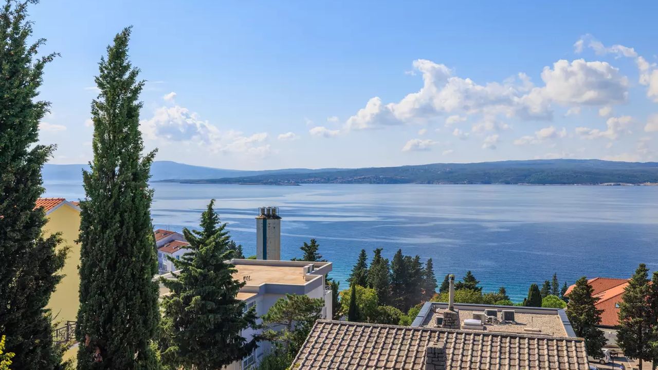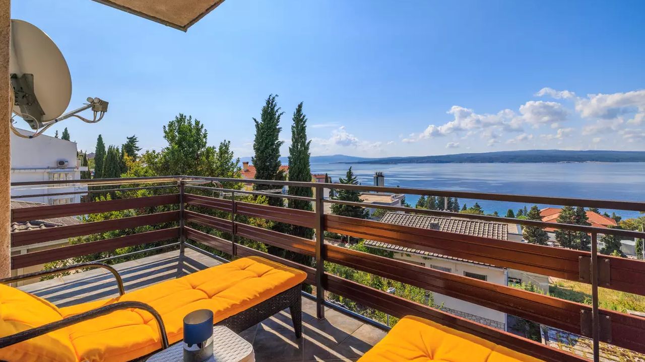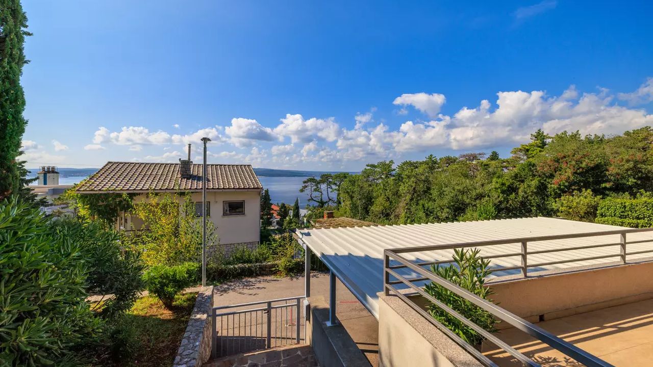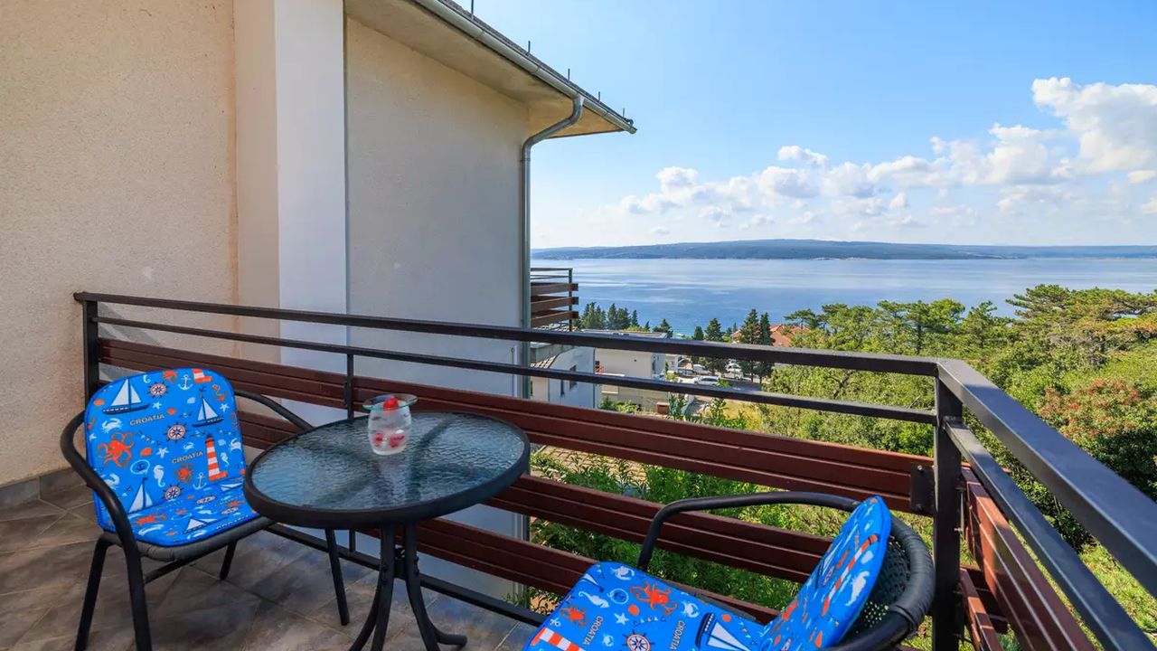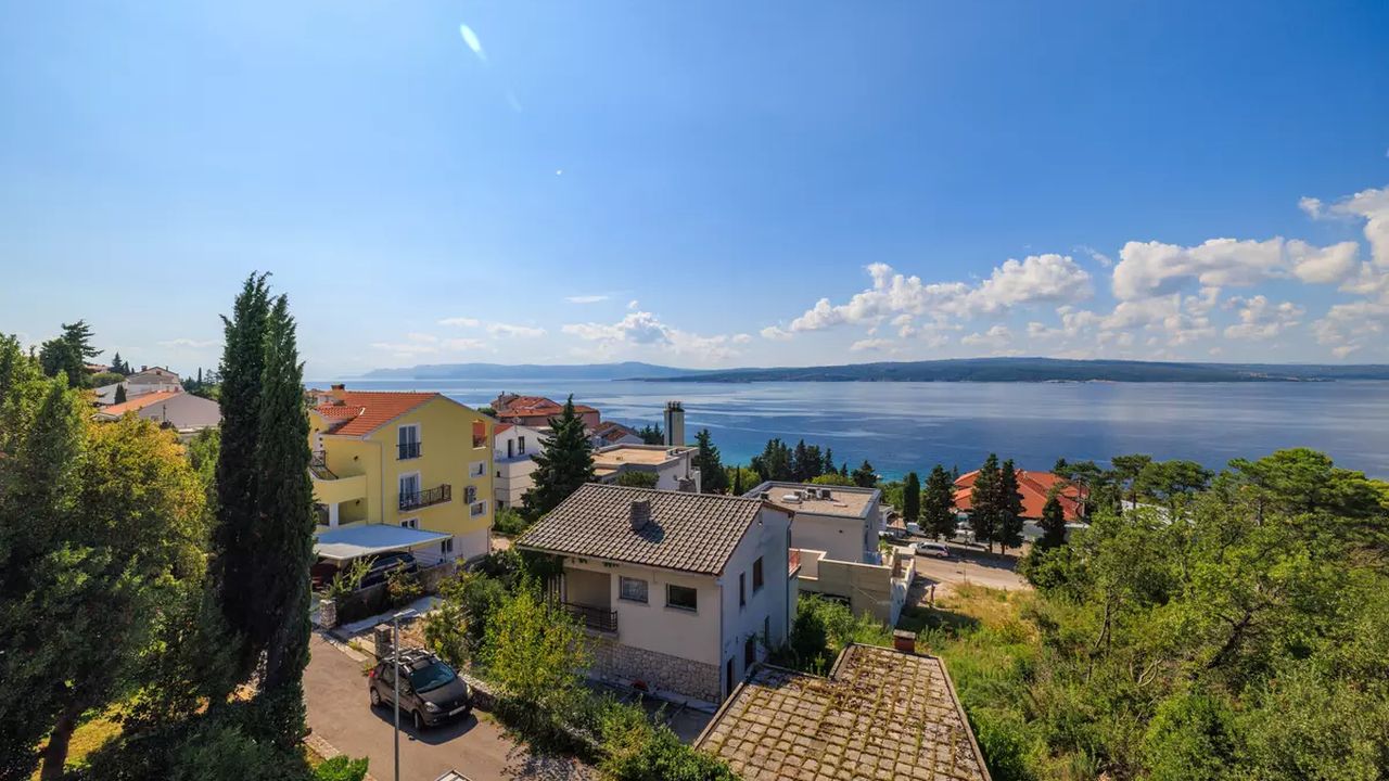 Im Ort Crikvenica in einem sch and ouml;nen Wohngebiet befindet sich diese sch and ouml;ne Ferienwohnung f and uuml;r 4-5 Personen.Die Wohnung befindet sich im 2 Obergeschoss eines Familienhauses und verf and uuml;gt and uuml;ber einen eigenen privaten Eingang. Bestehend aus einem Wohnzimmer,einer Essk and uuml;che aus der man einen Zugang zum S and uuml;dbalkon der 19 m and sup2; hat und einen traumhaften Meerblick bietet , zwei Schlafzimmern, zwei Badezimmer und noch einen weiteren 6 m and sup2; Balkon mit Meerblick zur Westseite.