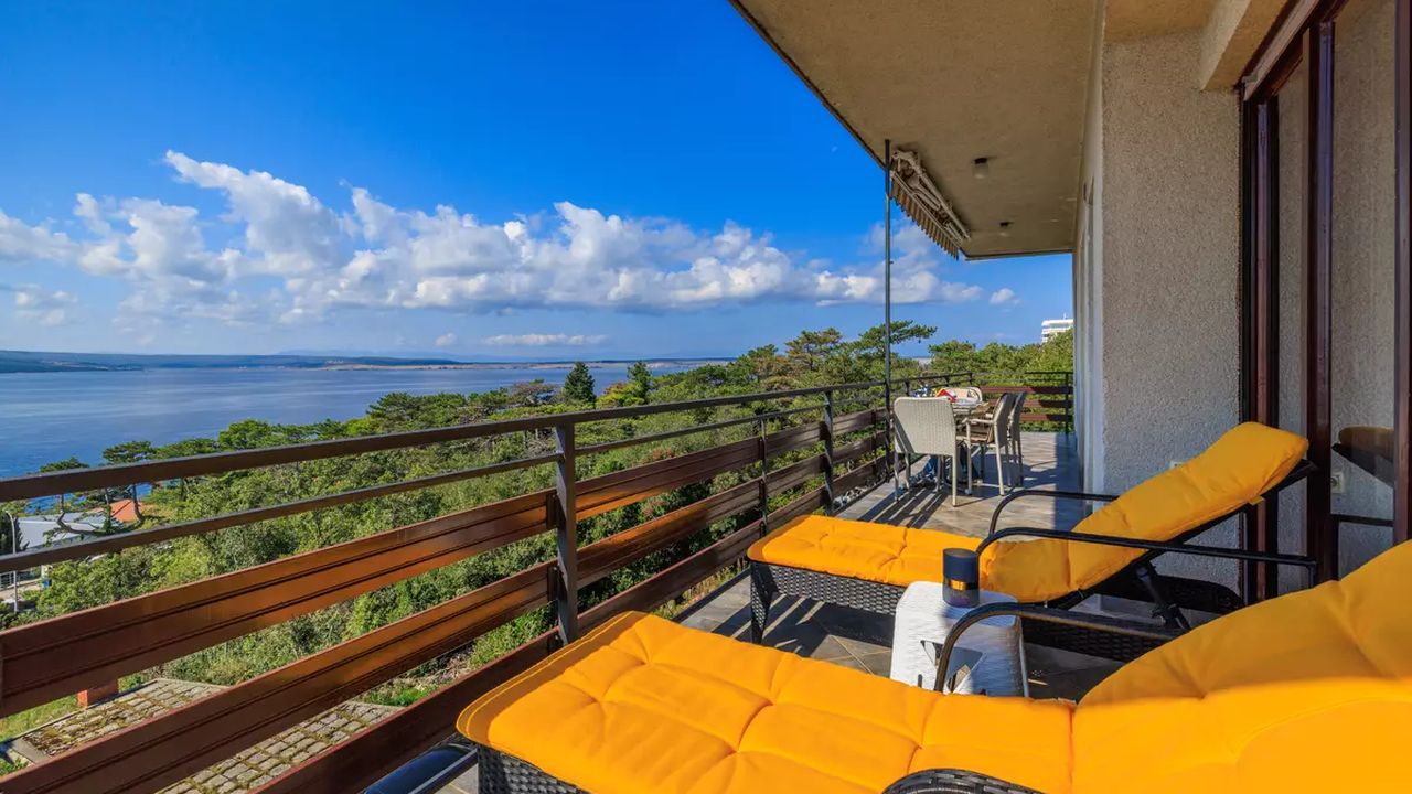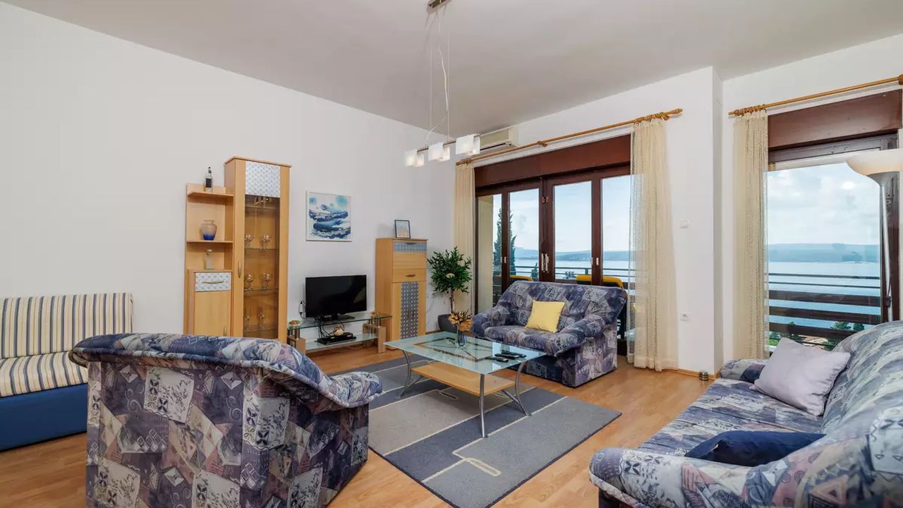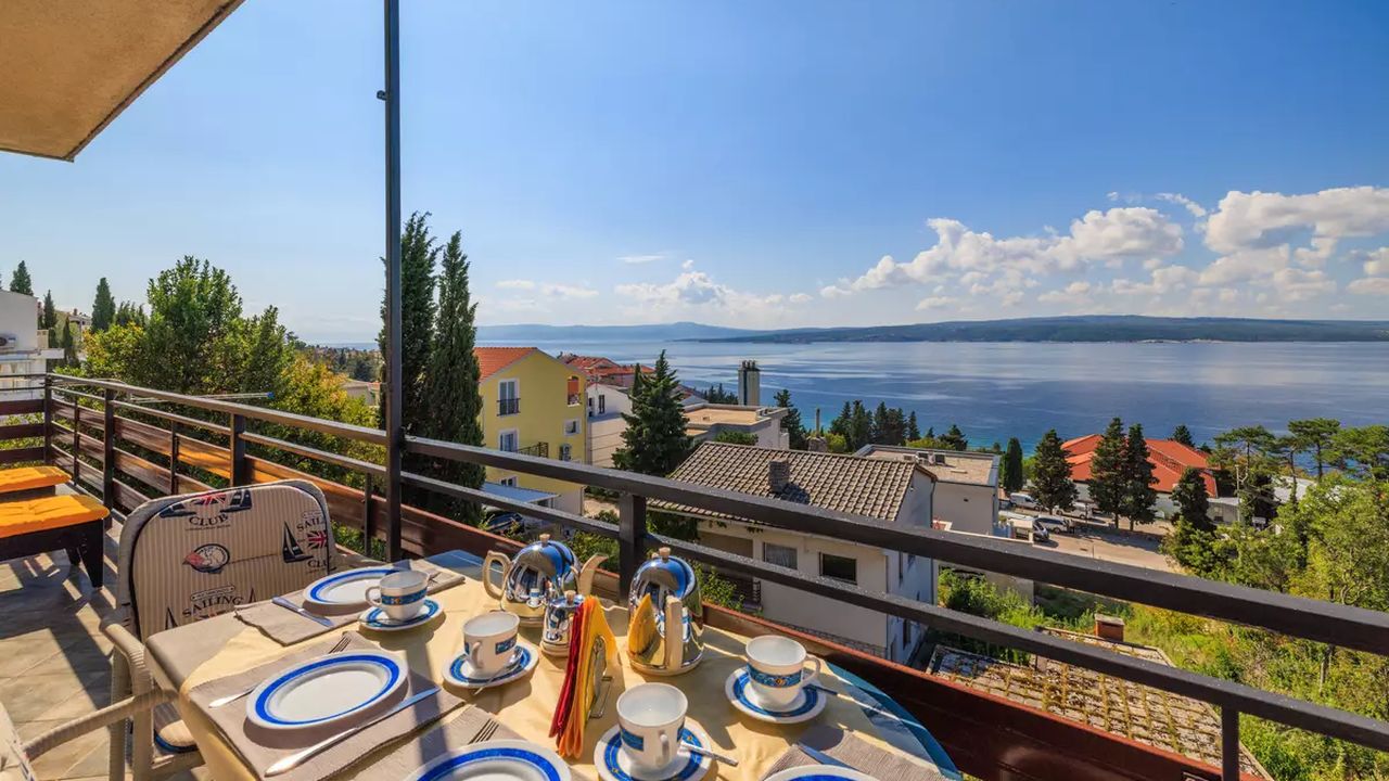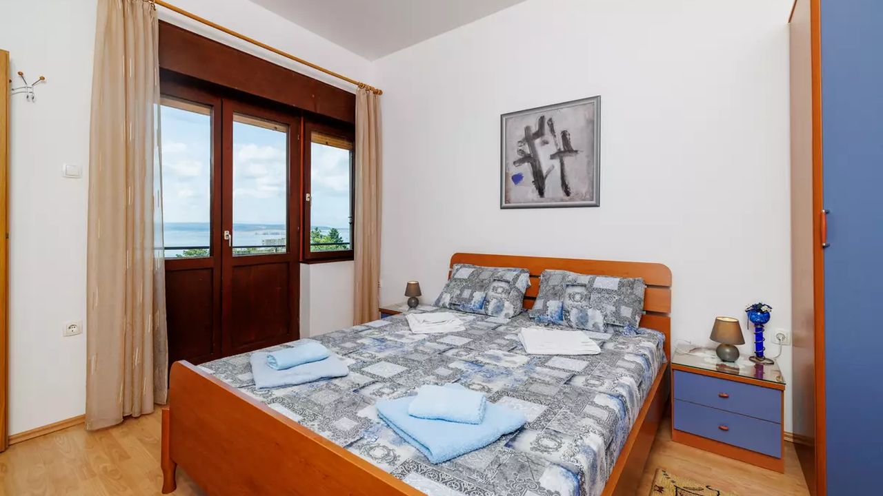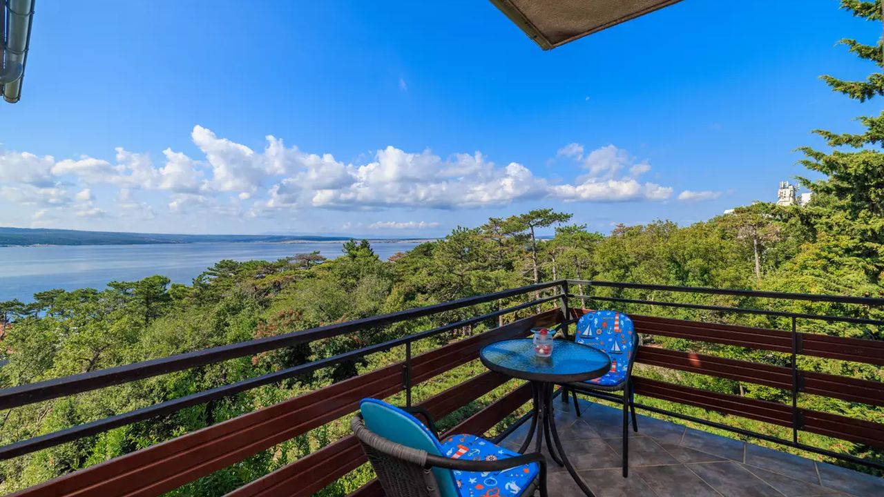 Im Ort Crikvenica in einem sch and ouml;nen Wohngebiet befindet sich diese sch and ouml;ne Ferienwohnung f and uuml;r 4-5 Personen.Die Wohnung befindet sich im 2 Obergeschoss eines Familienhauses und verf and uuml;gt and uuml;ber einen eigenen privaten Eingang. Bestehend aus einem Wohnzimmer,einer Essk and uuml;che aus der man einen Zugang zum S and uuml;dbalkon der 19 m and sup2; hat und einen traumhaften Meerblick bietet , zwei Schlafzimmern, zwei Badezimmer und noch einen weiteren 6 m and sup2; Balkon mit Meerblick zur Westseite.