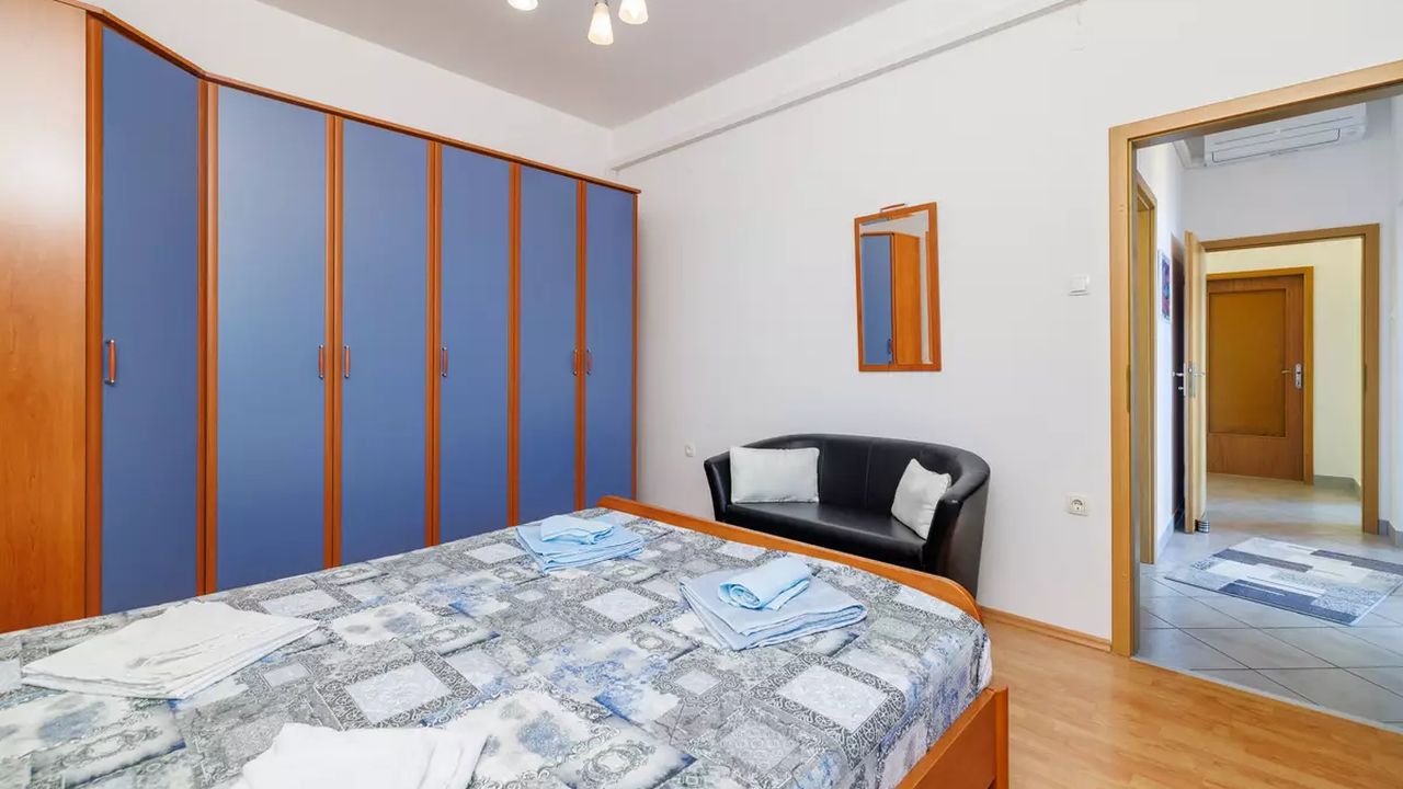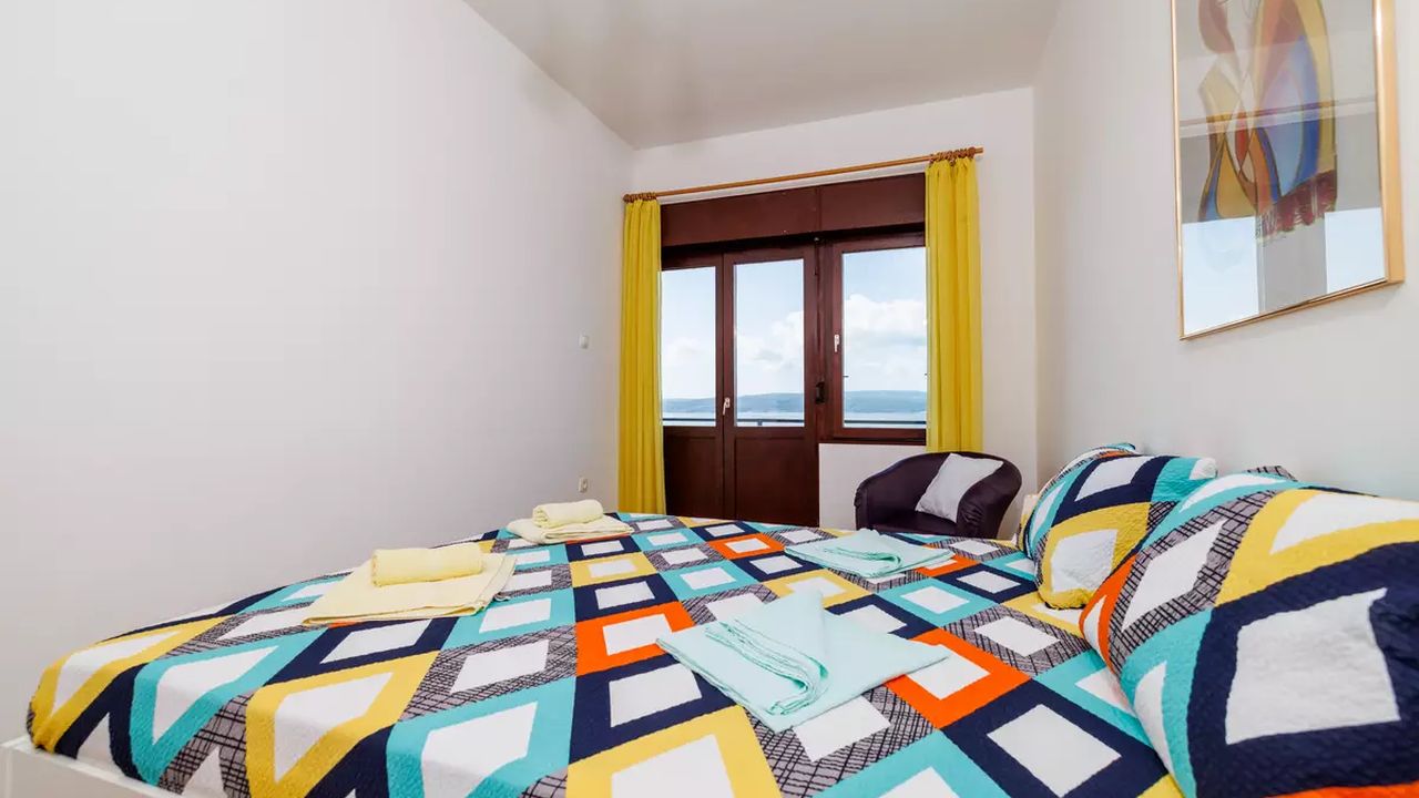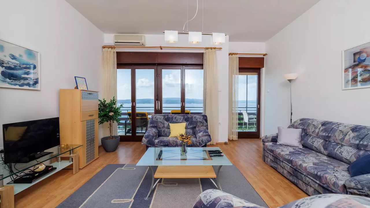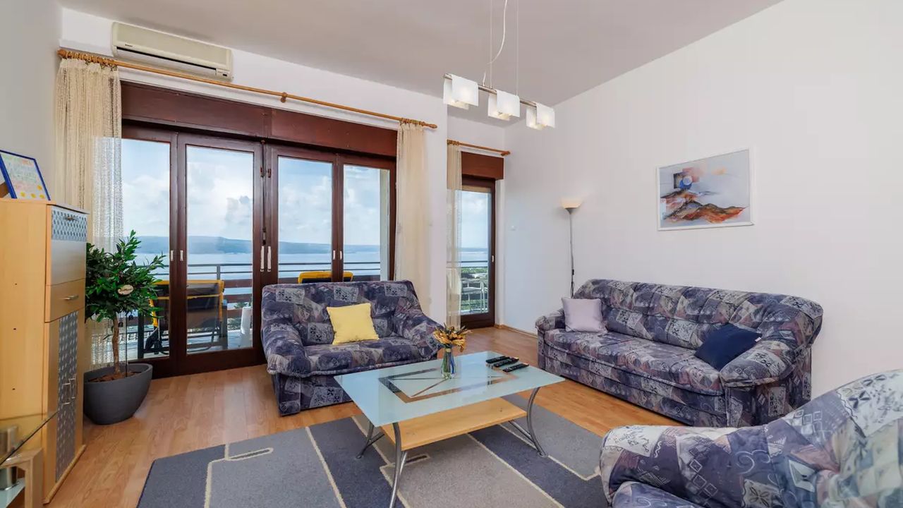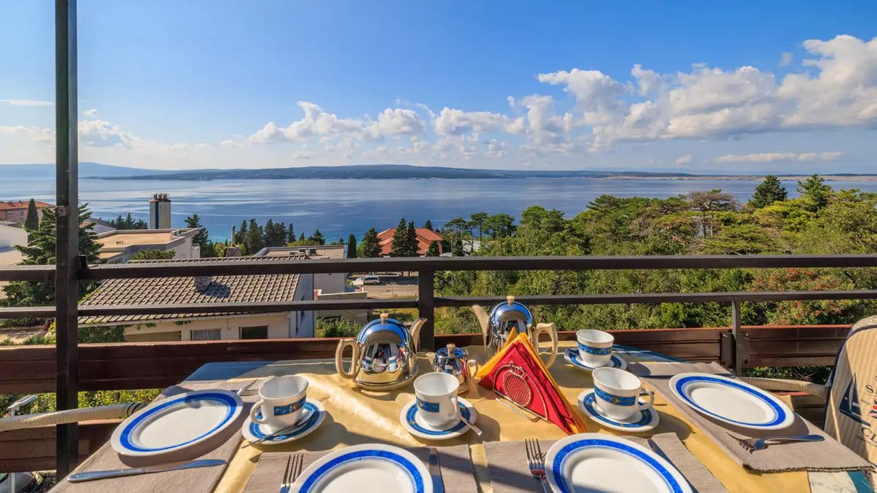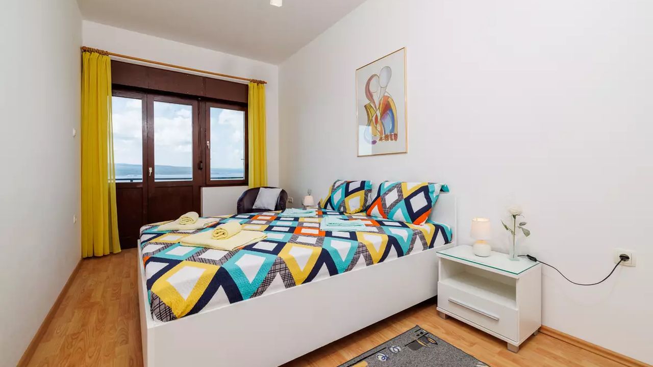 Im Ort Crikvenica in einem sch and ouml;nen Wohngebiet befindet sich diese sch and ouml;ne Ferienwohnung f and uuml;r 4-5 Personen.Die Wohnung befindet sich im 2 Obergeschoss eines Familienhauses und verf and uuml;gt and uuml;ber einen eigenen privaten Eingang. Bestehend aus einem Wohnzimmer,einer Essk and uuml;che aus der man einen Zugang zum S and uuml;dbalkon der 19 m and sup2; hat und einen traumhaften Meerblick bietet , zwei Schlafzimmern, zwei Badezimmer und noch einen weiteren 6 m and sup2; Balkon mit Meerblick zur Westseite.