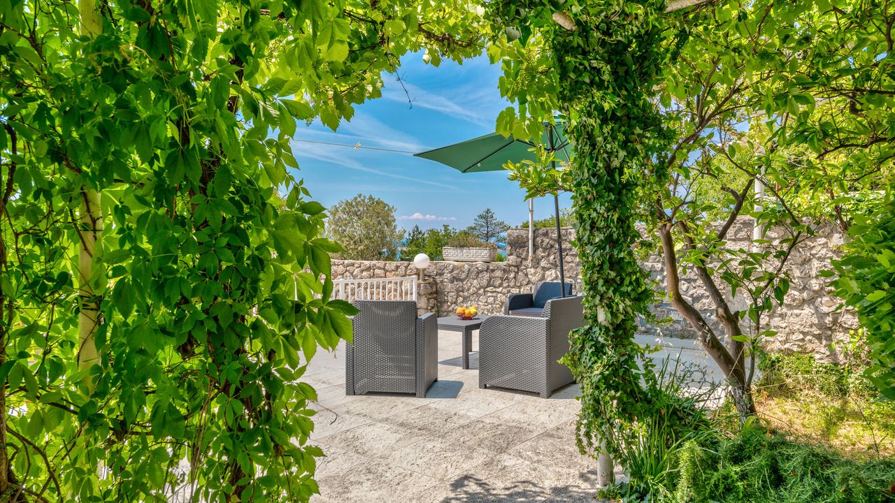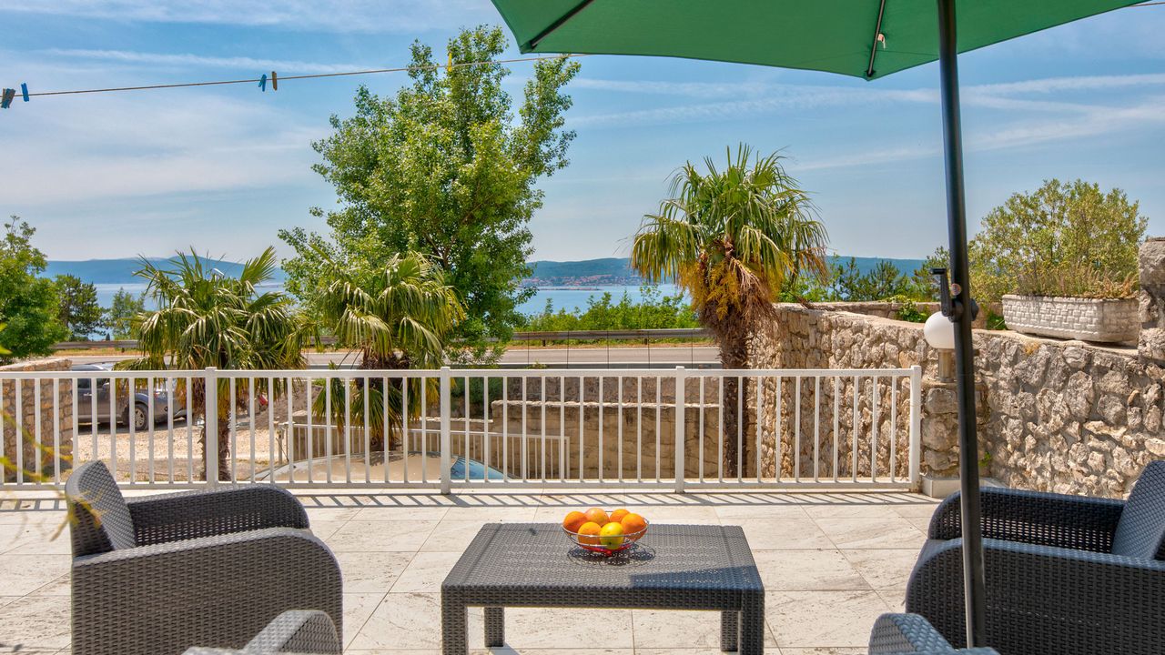 gemeinsame Terrasse, Meerblick, einen Stock tiefer, Bestuhlung, Liegen, Sonnenschirm, Terrassengr and ouml; and szlig;e: 60 m and sup2;