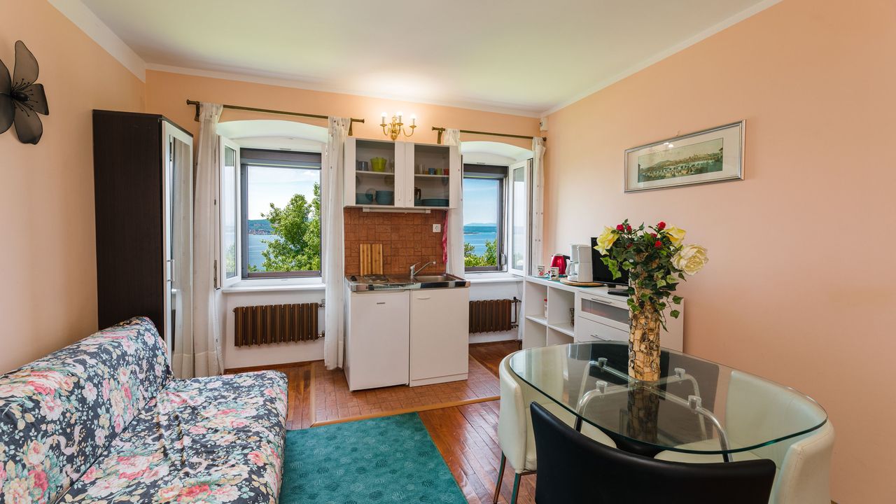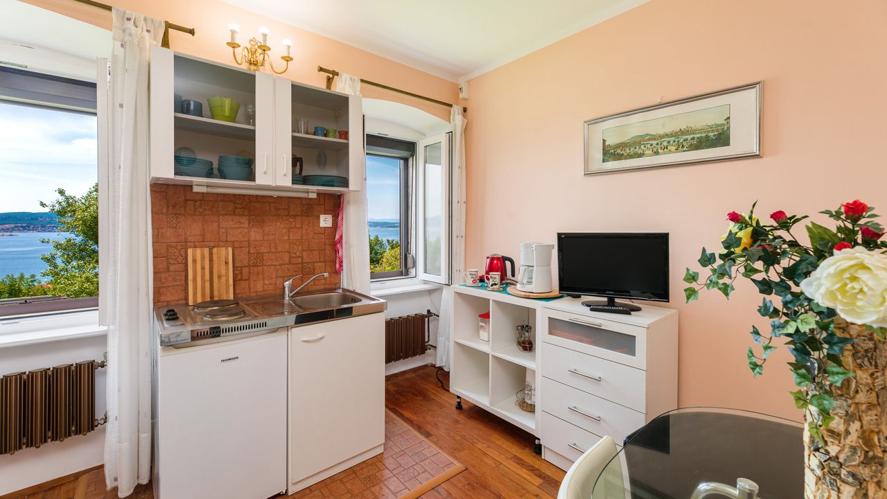Wohnbereich:Wohn/Esszimmer und K and uuml;che sind ein Raum, Meerblick, Parkett, Fliesen