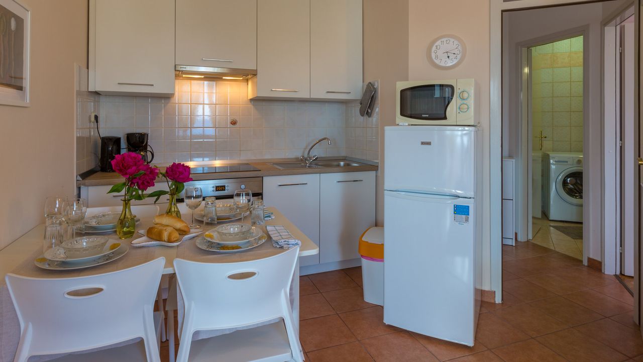 K and uuml;che, Geschirr, K and uuml;chenhandt and uuml;cher, Elektroherd, Kochplatten: 4, Backr and ouml;hre, K and uuml;hlschrank mit Gefrierfach, Filterkaffeemaschine, Mikrowelle, Toaster, Geschirrsp and uuml;lmaschine
