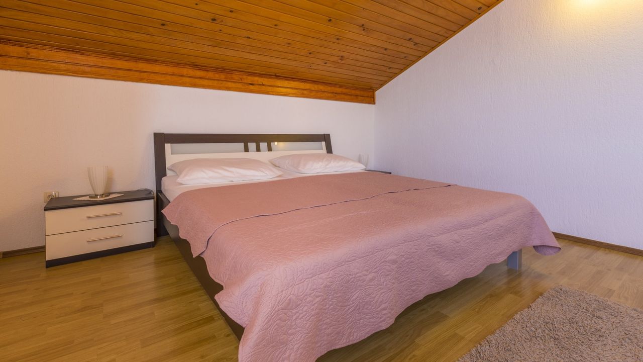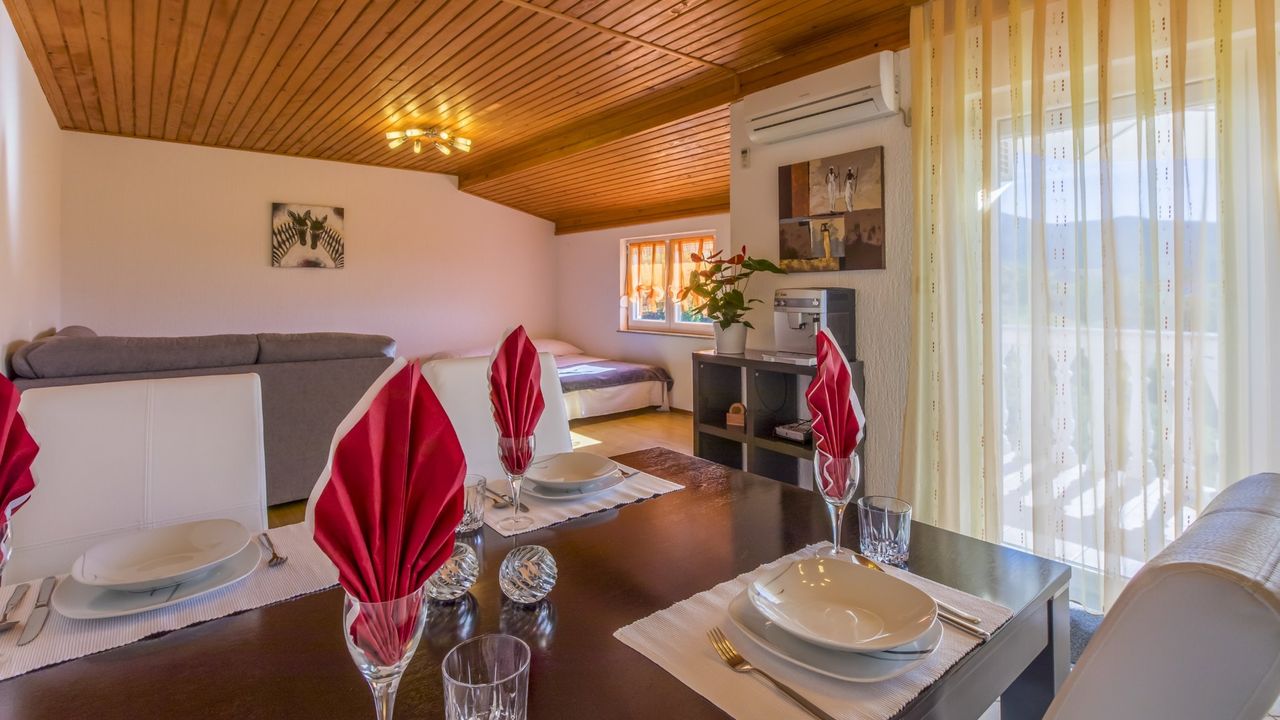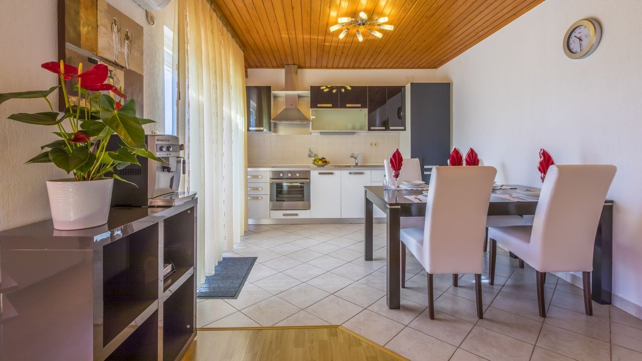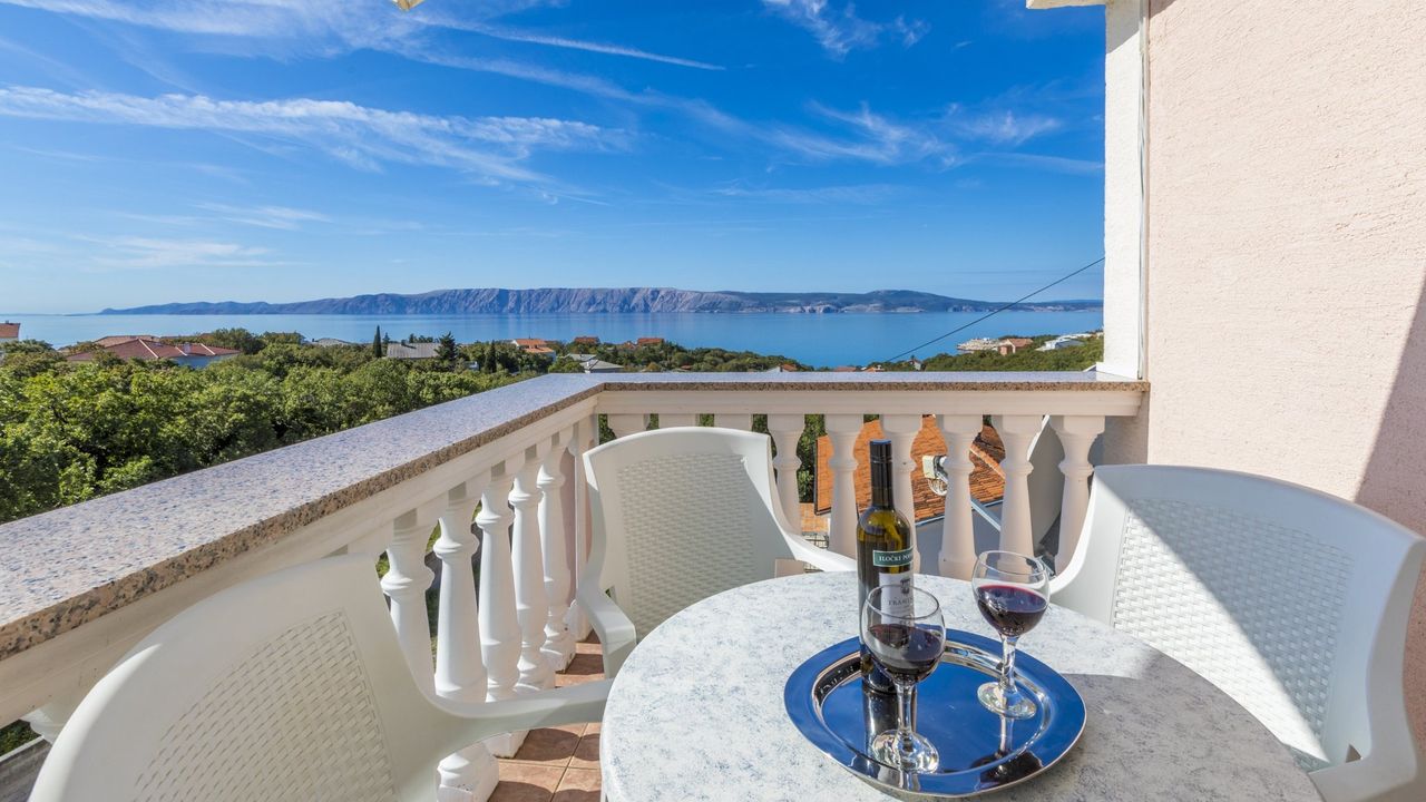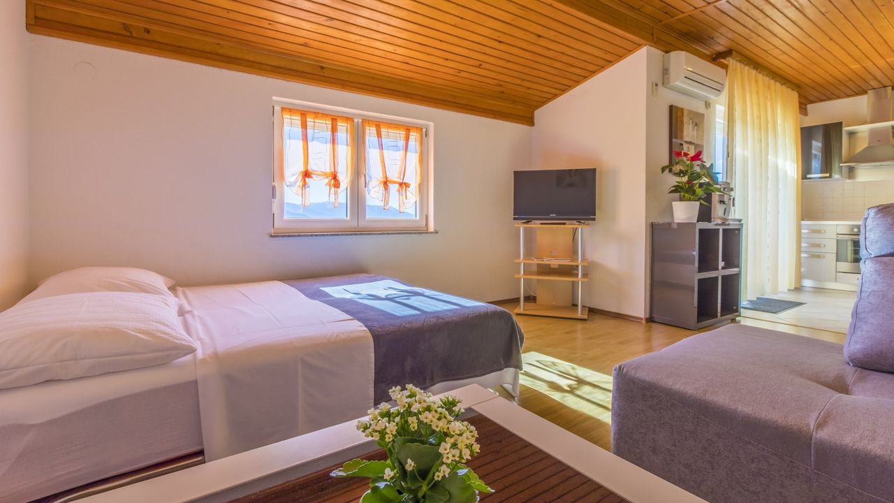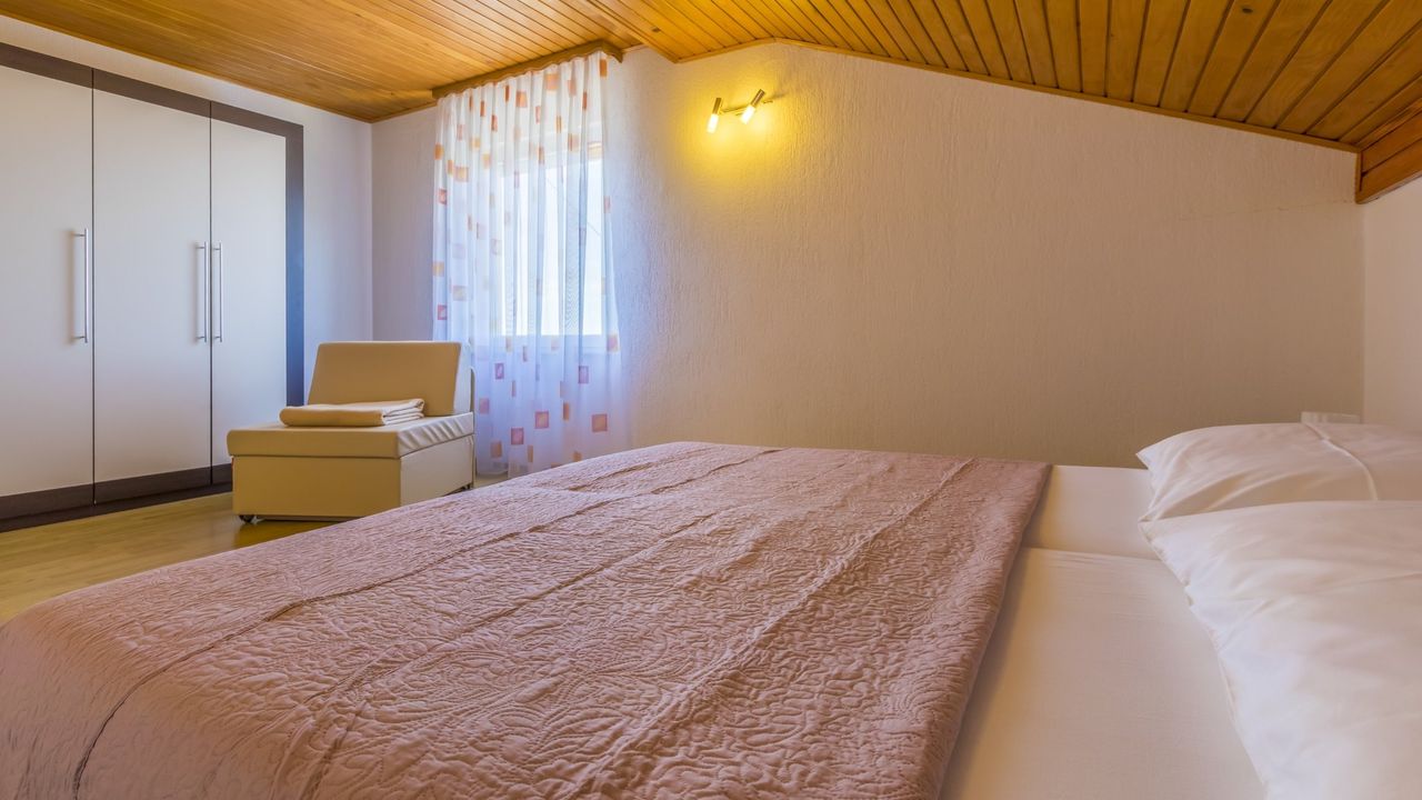 Moderne Ferienwohnung im ruhigen Fischerort Povile das ca 15 km von Crikvenica entfernt.Das Dachgeschossapartment besteht aus einem gem and uuml;tlichen Wohn/Esszimmer mit K and uuml;che,in dem sich eine Schlafcouch f and uuml;r 2 Personen befindet, 1 Schlafzimmer mit Doppelbett, 1 Schlafzimmer mit Einzelbett und 1 Badezimmer. Von der K and uuml;xhe aus hat man Zugang zum Balkon der einen fantastischen Ausblick auf das Meer und die Insel Krk hat.