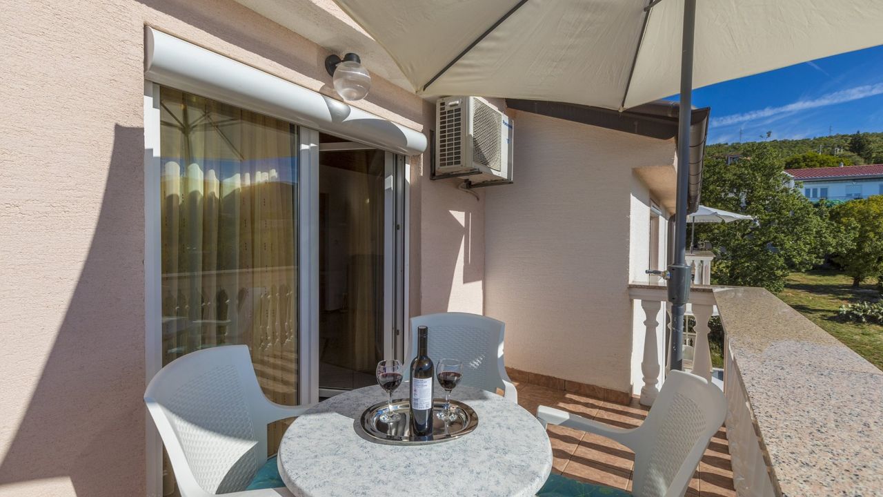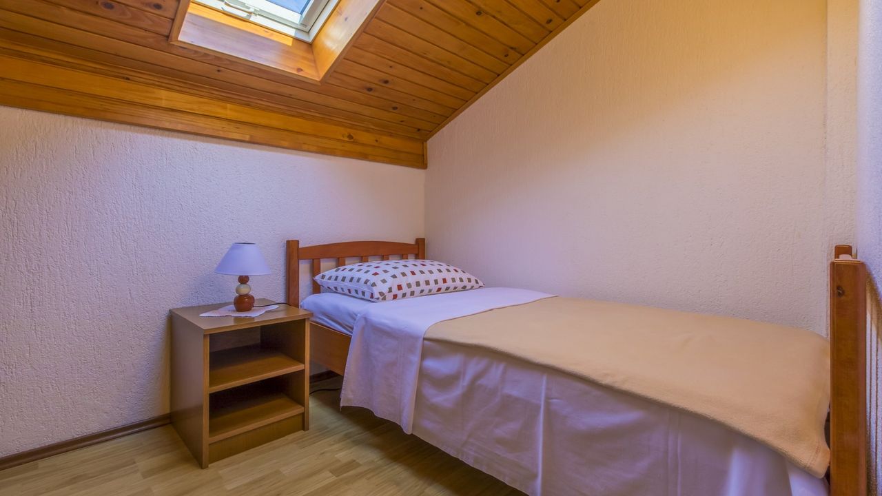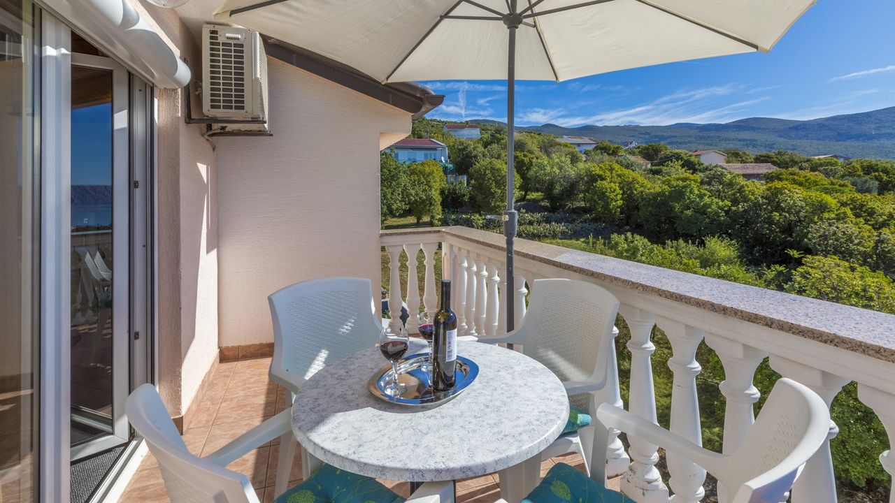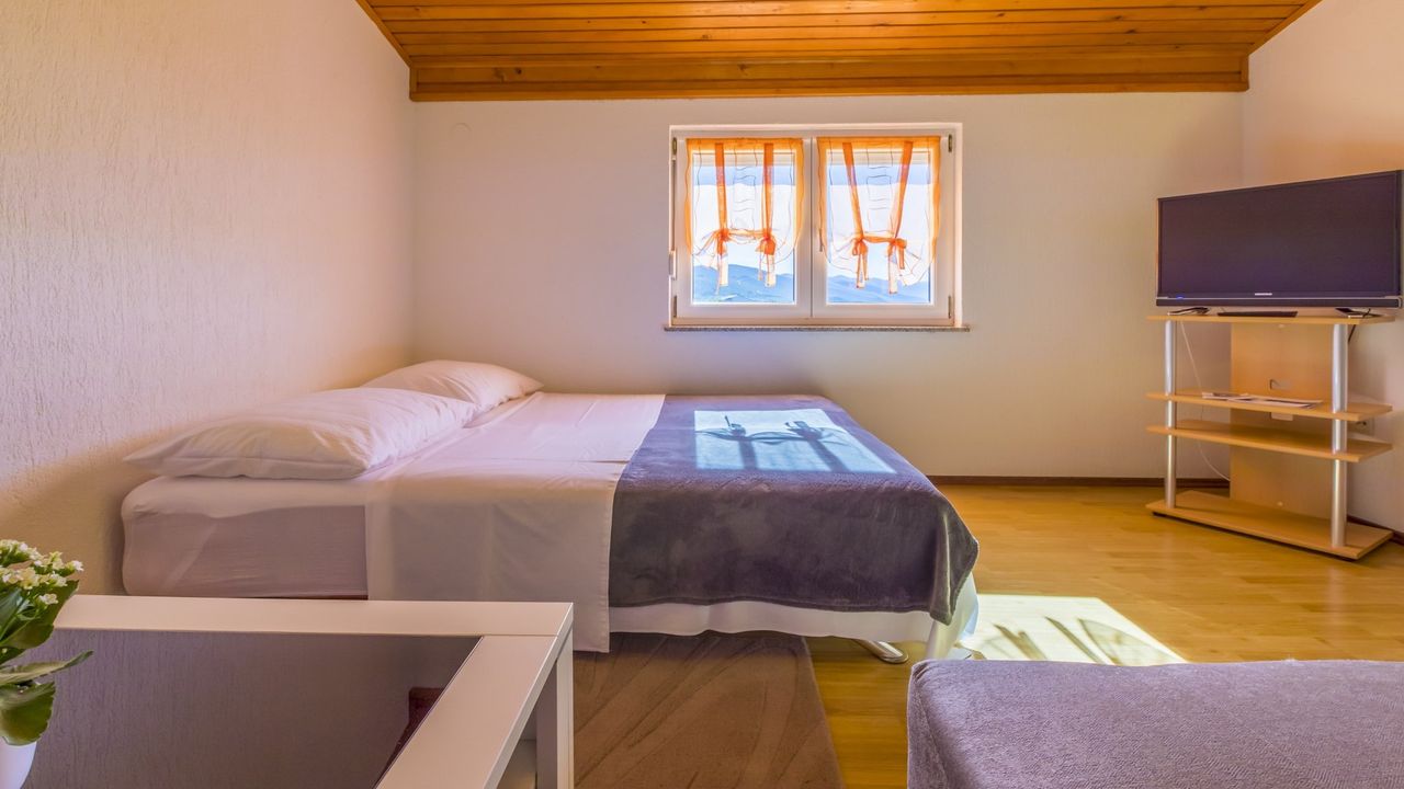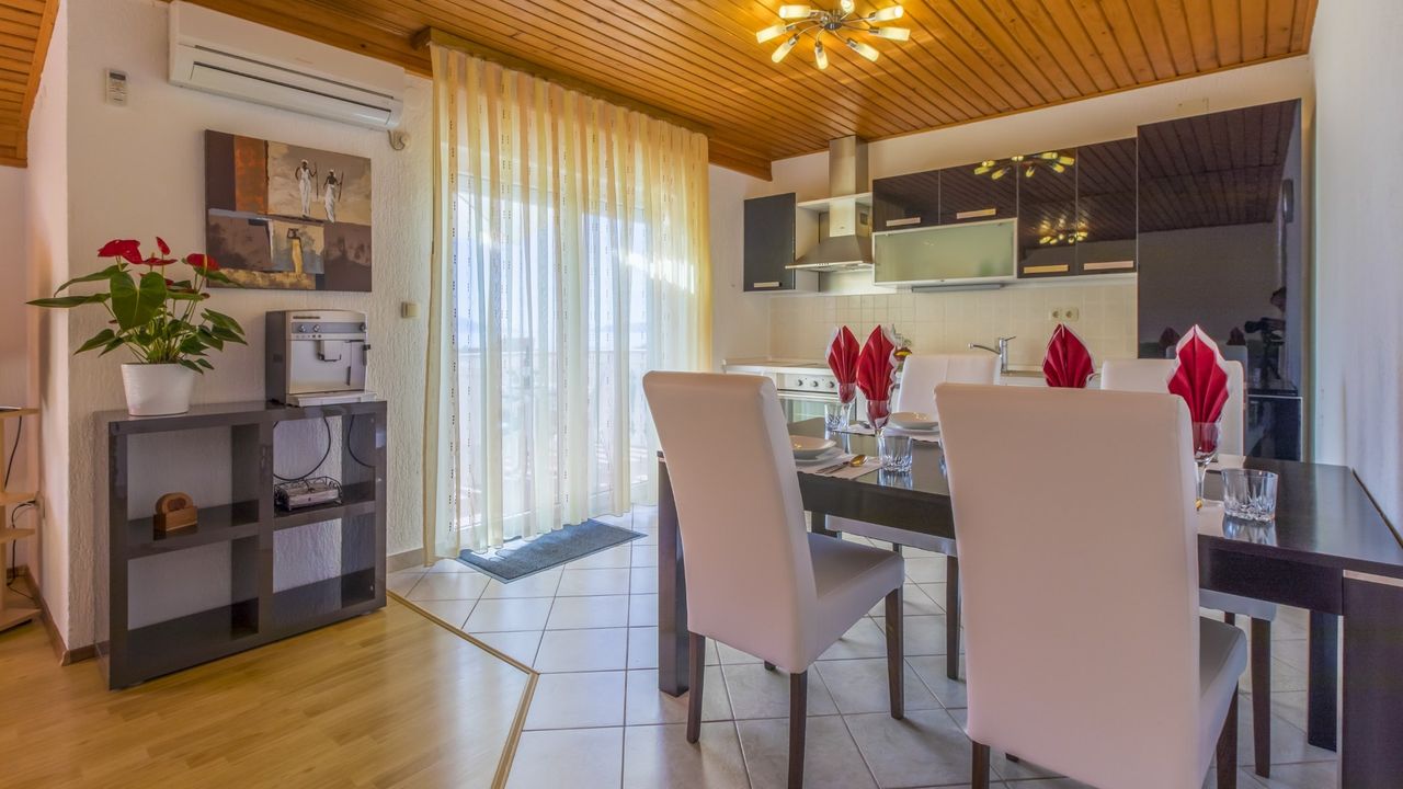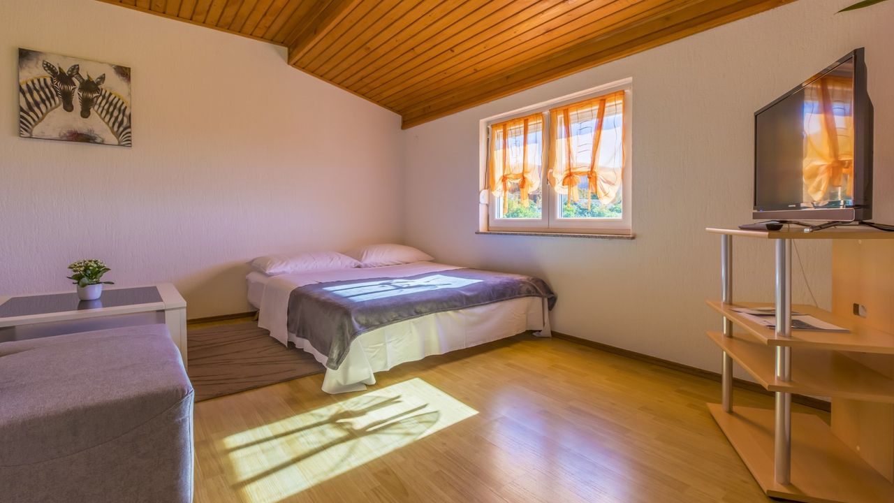 Moderne Ferienwohnung im ruhigen Fischerort Povile das ca 15 km von Crikvenica entfernt.Das Dachgeschossapartment besteht aus einem gem and uuml;tlichen Wohn/Esszimmer mit K and uuml;che,in dem sich eine Schlafcouch f and uuml;r 2 Personen befindet, 1 Schlafzimmer mit Doppelbett, 1 Schlafzimmer mit Einzelbett und 1 Badezimmer. Von der K and uuml;xhe aus hat man Zugang zum Balkon der einen fantastischen Ausblick auf das Meer und die Insel Krk hat.