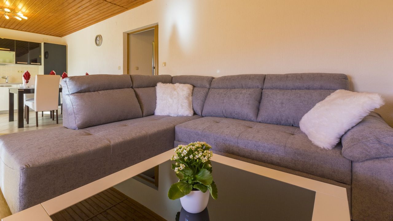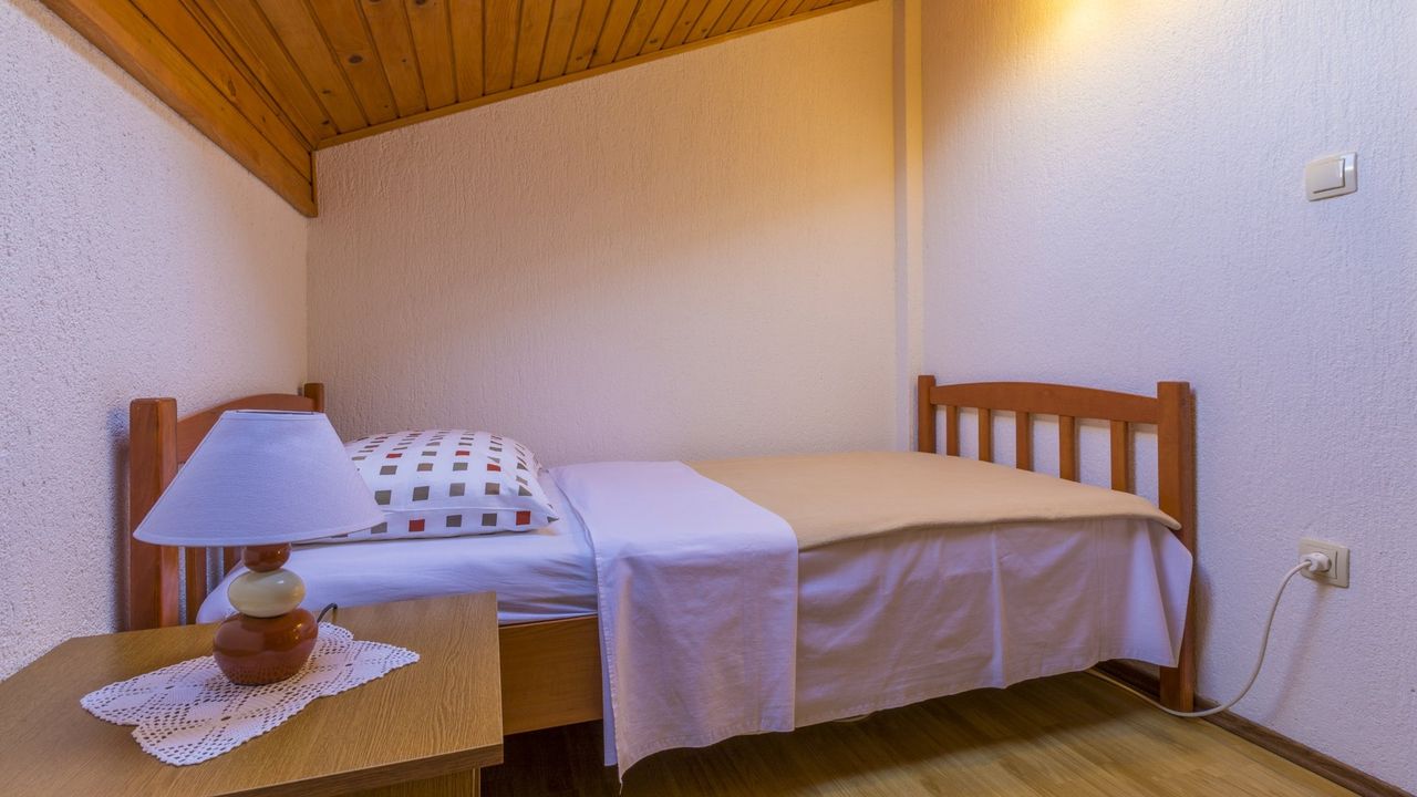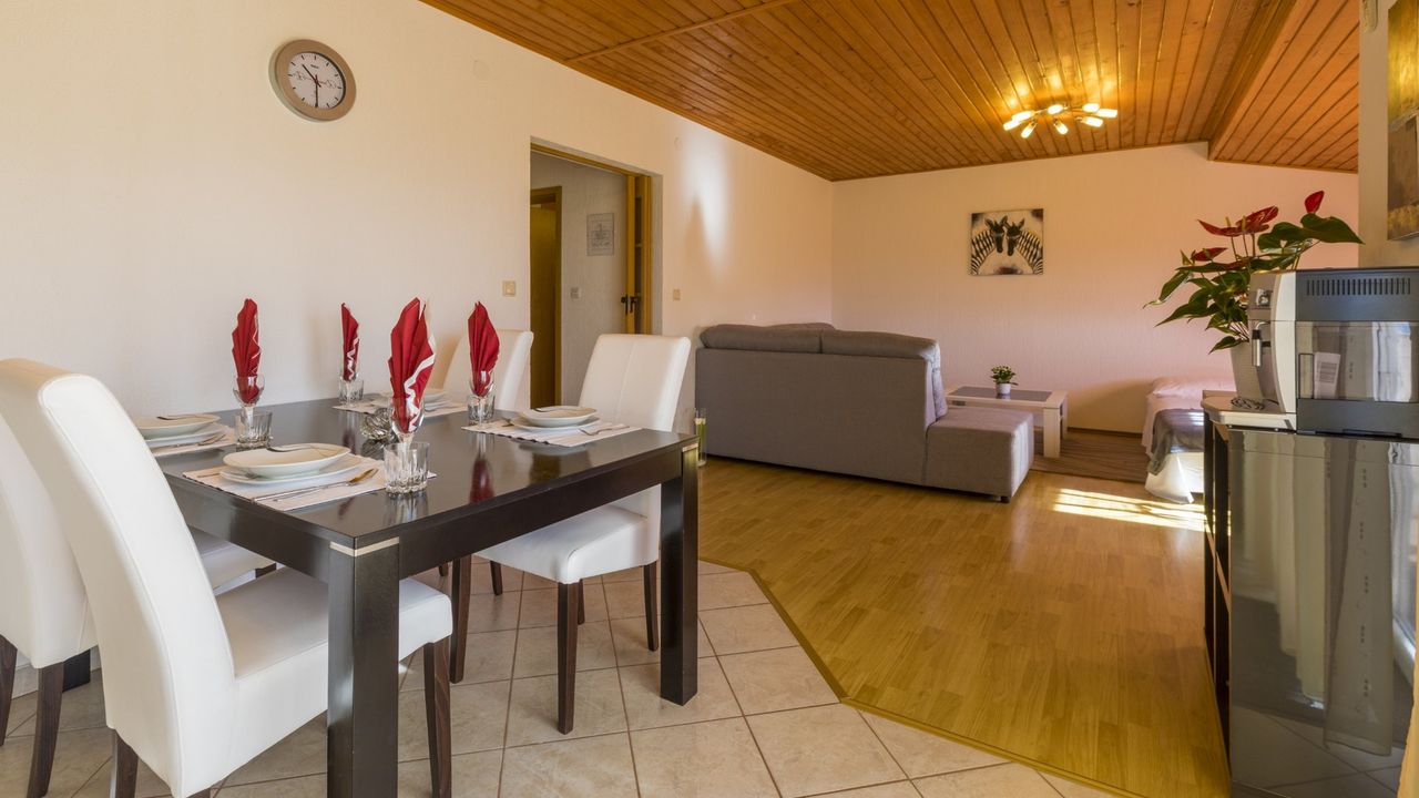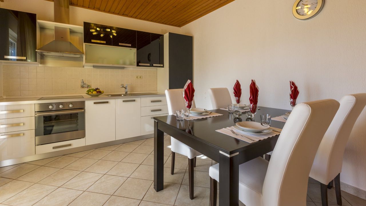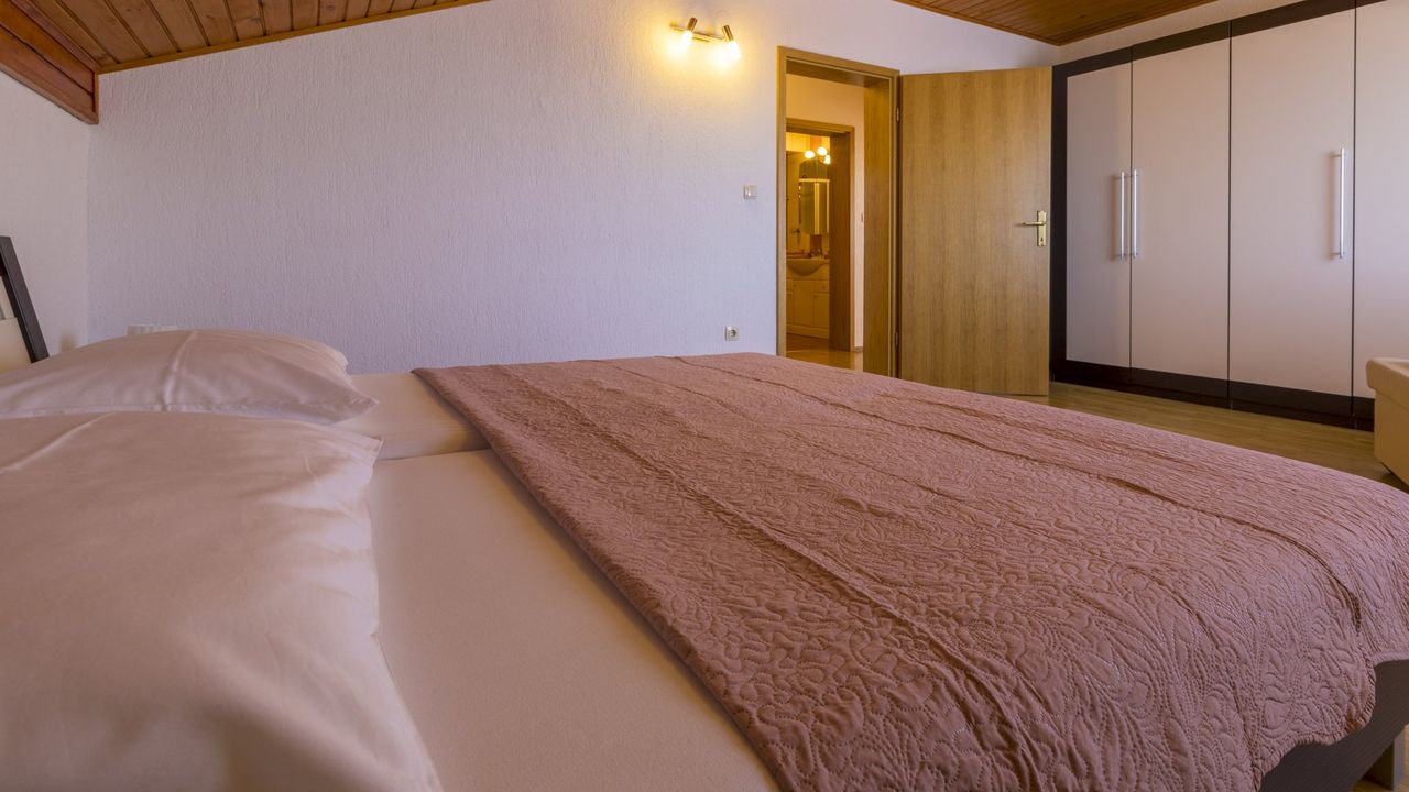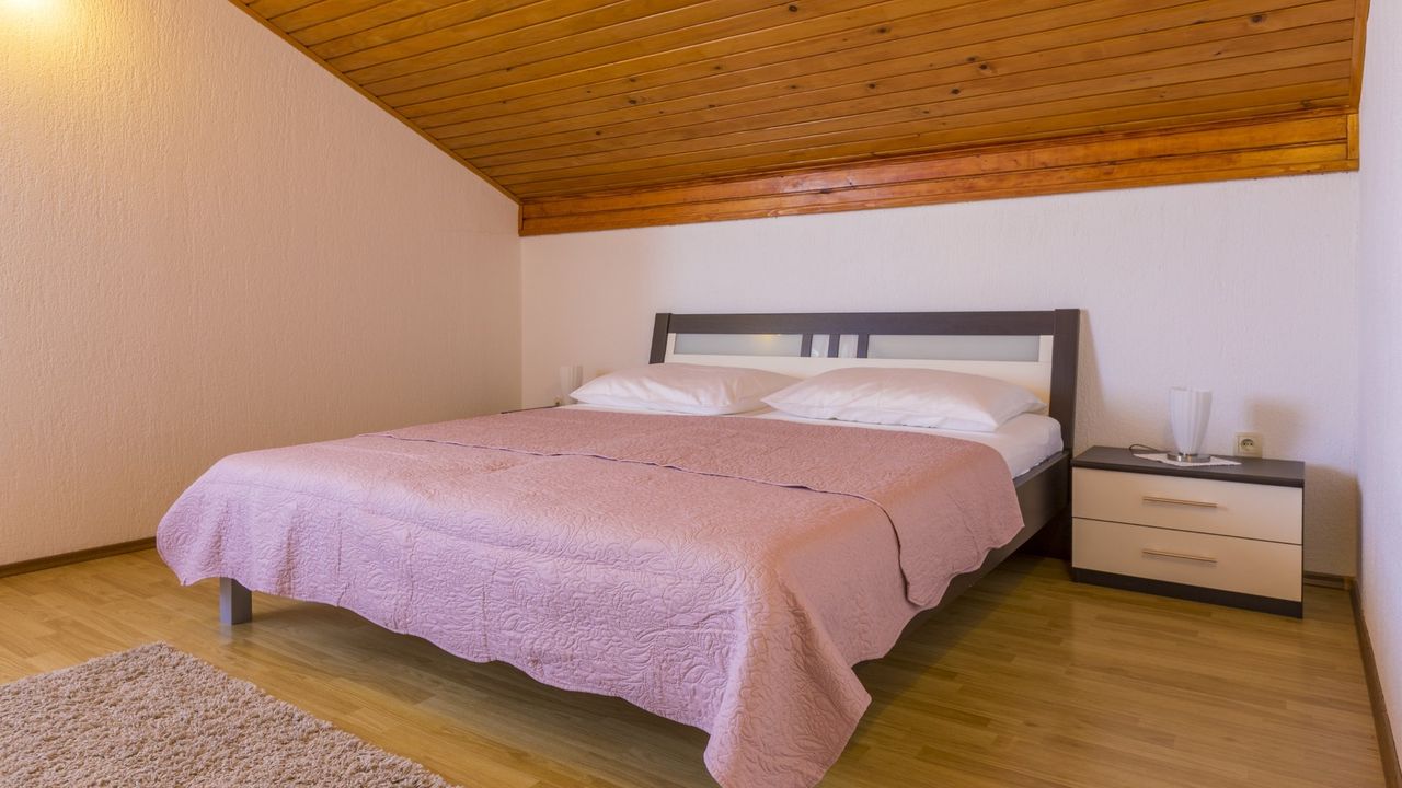 Moderne Ferienwohnung im ruhigen Fischerort Povile das ca 15 km von Crikvenica entfernt.Das Dachgeschossapartment besteht aus einem gem and uuml;tlichen Wohn/Esszimmer mit K and uuml;che,in dem sich eine Schlafcouch f and uuml;r 2 Personen befindet, 1 Schlafzimmer mit Doppelbett, 1 Schlafzimmer mit Einzelbett und 1 Badezimmer. Von der K and uuml;xhe aus hat man Zugang zum Balkon der einen fantastischen Ausblick auf das Meer und die Insel Krk hat.