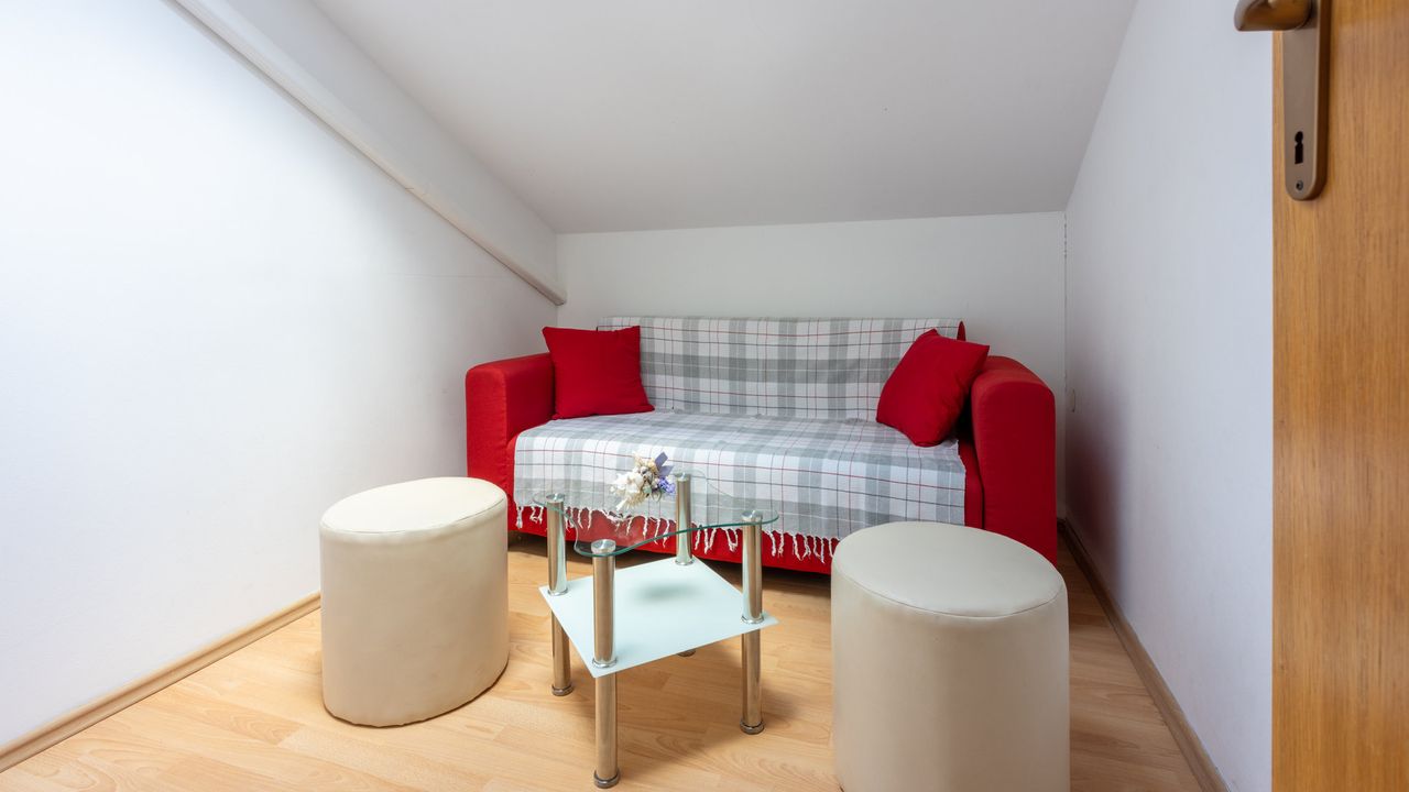 separates Wohnzimmer, Esszimmer und K and uuml;che sind ein Raum, Schlafcouch f and uuml;r zwei Personen, Fliesen, Sat-TV