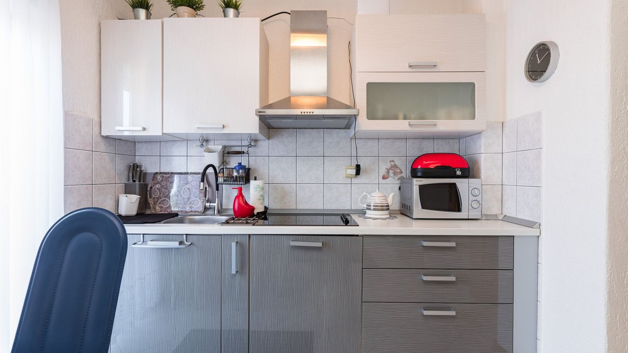 K and uuml;che, Geschirr, K and uuml;chenhandt and uuml;cher, Elektroherd, Kochplatten: 4, Backr and ouml;hre, K and uuml;hlschrank mit Gefrierfach, Filterkaffeemaschine, Wasserkocher, Mikrowelle, Toaster