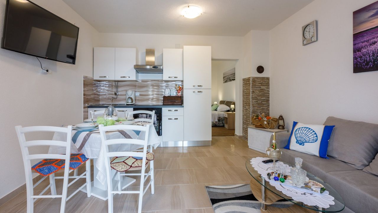 Wohn/Esszimmer und K and uuml;che sind ein Raum, Schlafcouch f and uuml;r zwei Personen, Terrasse, Meerblick, Fliesen, Sat-TV