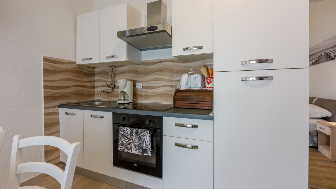 K and uuml;che, Geschirr, K and uuml;chenhandt and uuml;cher, Elektroherd, Kochplatten: 4, Backr and ouml;hre, K and uuml;hlschrank mit Gefrierfach, Filterkaffeemaschine, Wasserkocher, Toaster