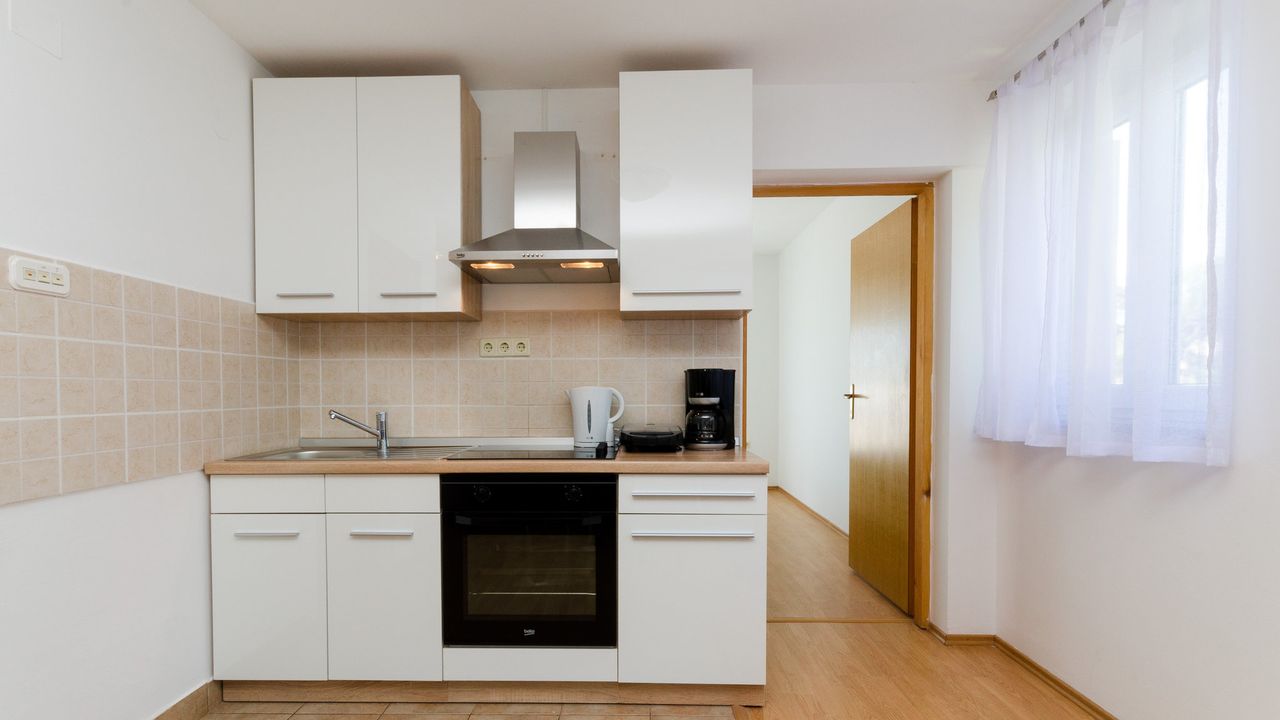 K and uuml;che, Geschirr, Elektroherd, Kochplatten: 4, Backr and ouml;hre, K and uuml;hlschrank mit Gefrierfach, Filterkaffeemaschine, Wasserkocher, Mikrowelle, Toaster