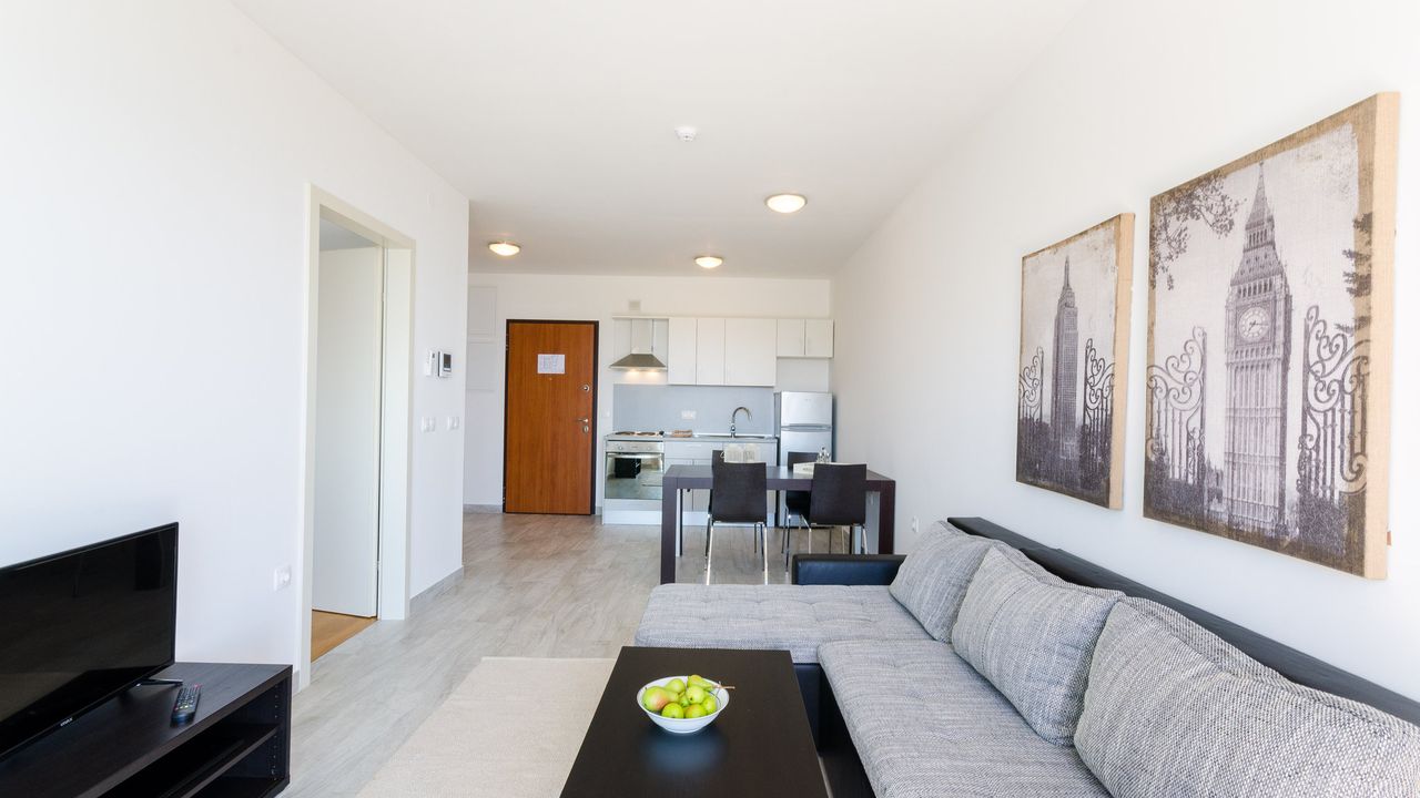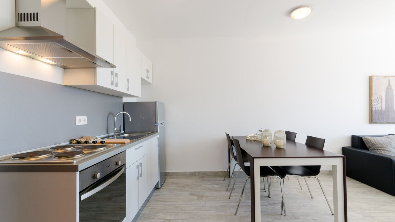 Wohn/Esszimmer und K and uuml;che sind ein Raum, Schlafcouch f and uuml;r zwei Personen, Balkon, Meerblick, Fliesen, Sat-TV