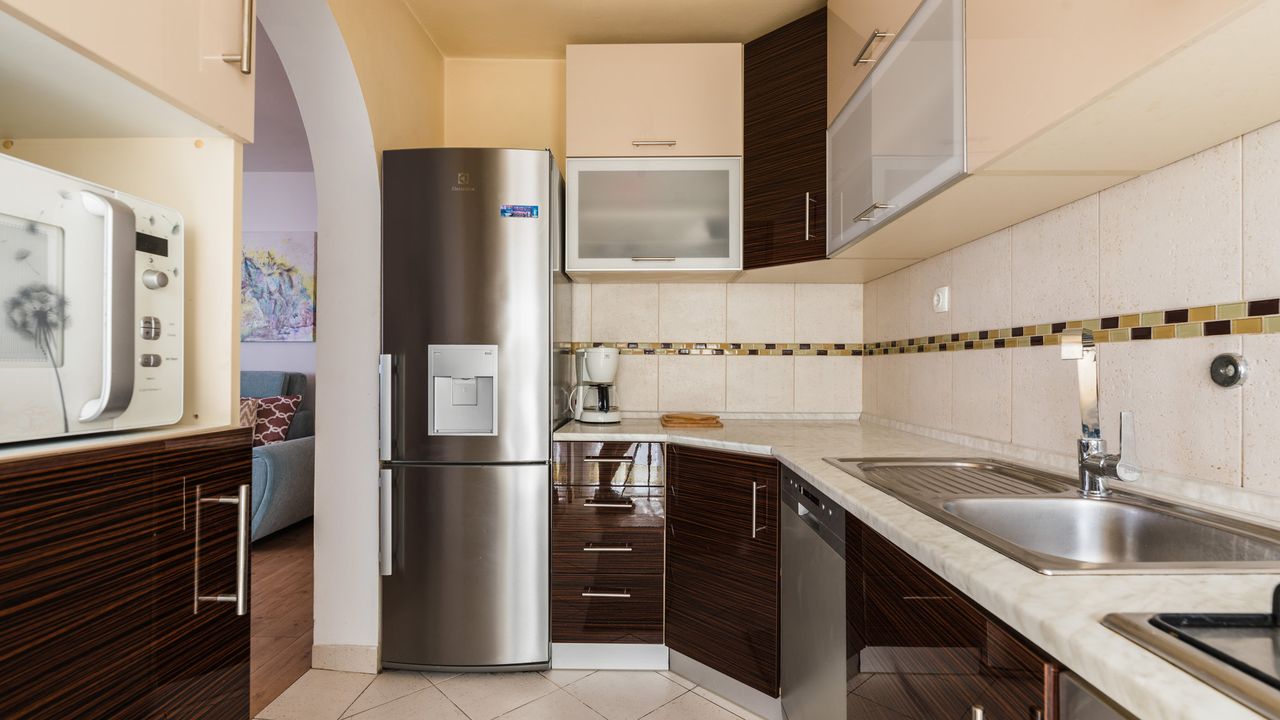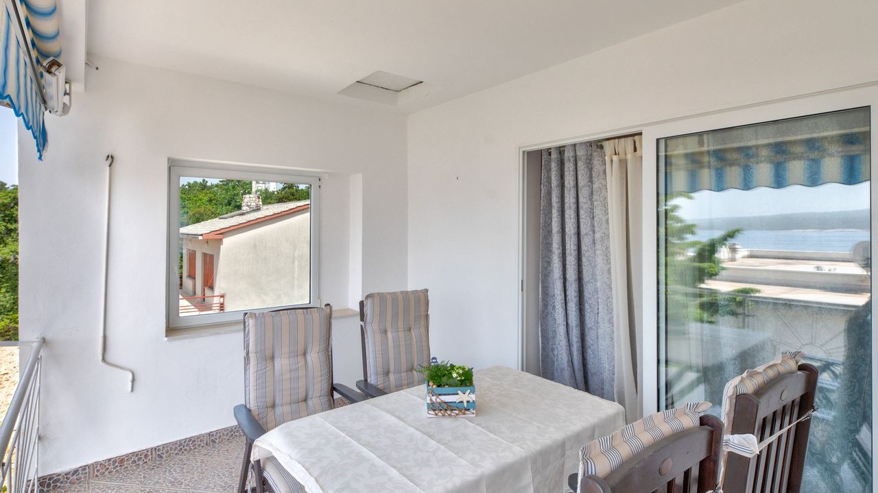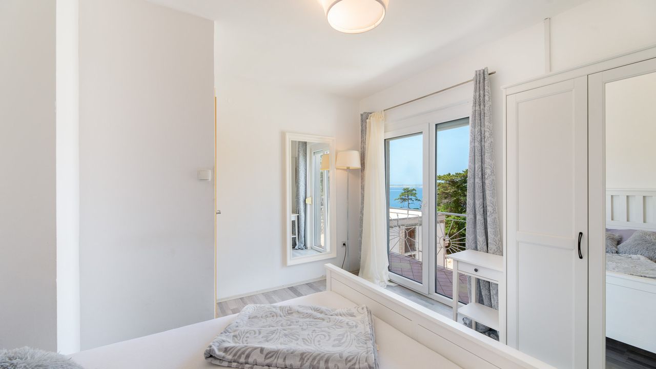 Sehr gem and uuml;tliche und zweckvoll eingerichtete Ferienwohnung f and uuml;r 4 Personen in einer sehr sch and ouml;nen Lage, nur ein paar Gehminuten vom Meer entfernt.Die Wohnung besteht aus einem Wohn/Esszimmer und K and uuml;che in einem offenem Raum, zwei Schlfzimmern, einem Badezimmer und einem tollen, and uuml;berdachten Balkon mit Meerblick. Aus einem Schlafzimmer und dem Essbereich kommt man zu dem Balkon zur Meerseite.