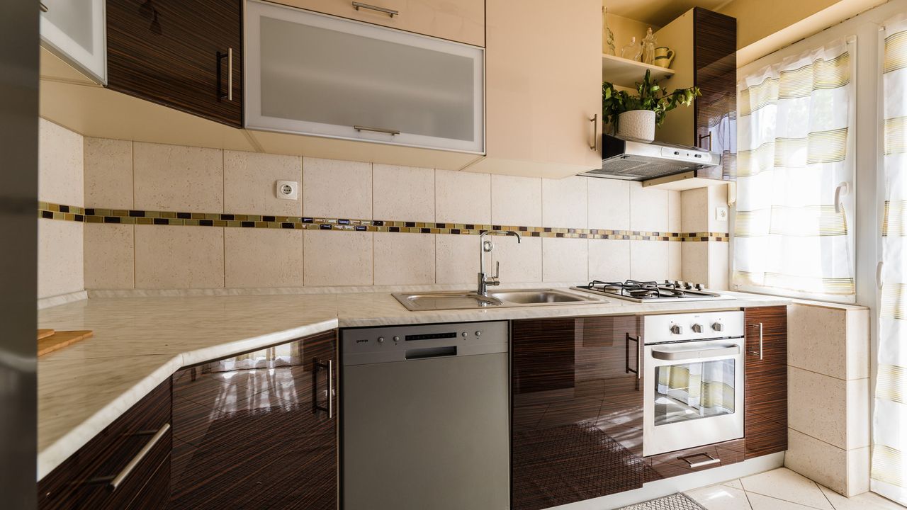 K and uuml;che, Geschirr, K and uuml;chenhandt and uuml;cher, Elektro/Gasherd kombiniert, Kochplatten: 4, Backr and ouml;hre, K and uuml;hlschrank mit Gefrierfach, Filterkaffeemaschine, Wasserkocher, Mikrowelle, Toaster, Geschirrsp and uuml;lmaschine