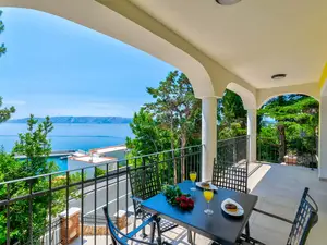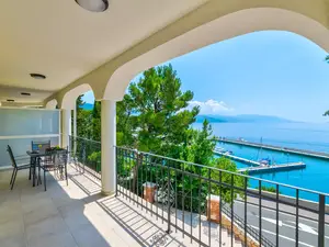 Auf 60 m and sup2; Wohnfl and auml;che bietet diese Ferienwohnung eine gute Raumaufteilung. Sie besteht aus einem stylischen Wohn/Esszimmer mit einer voll ausgestatteten K and uuml;che und zwei Schlafzimmern mit jeweils einem eigenem Badezimmer. Zu dieser Wohnung geh and ouml;rt ein eigener Balkon welcher vom Wohnbereich aus erreichbar ist. Dieser ist and uuml;berdacht und verf and uuml;gt and uuml;ber einen traumhaften Blick aufs Meer und die naheliegenden Inseln Krk und Rab.