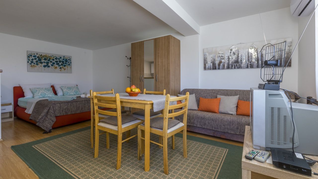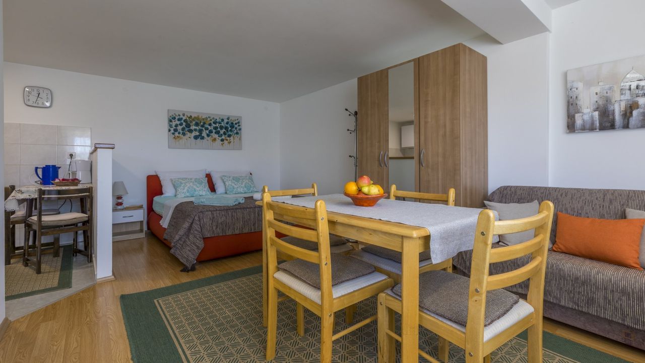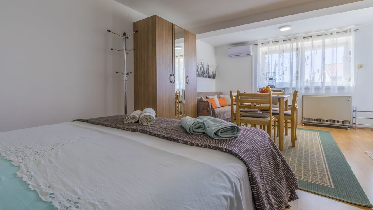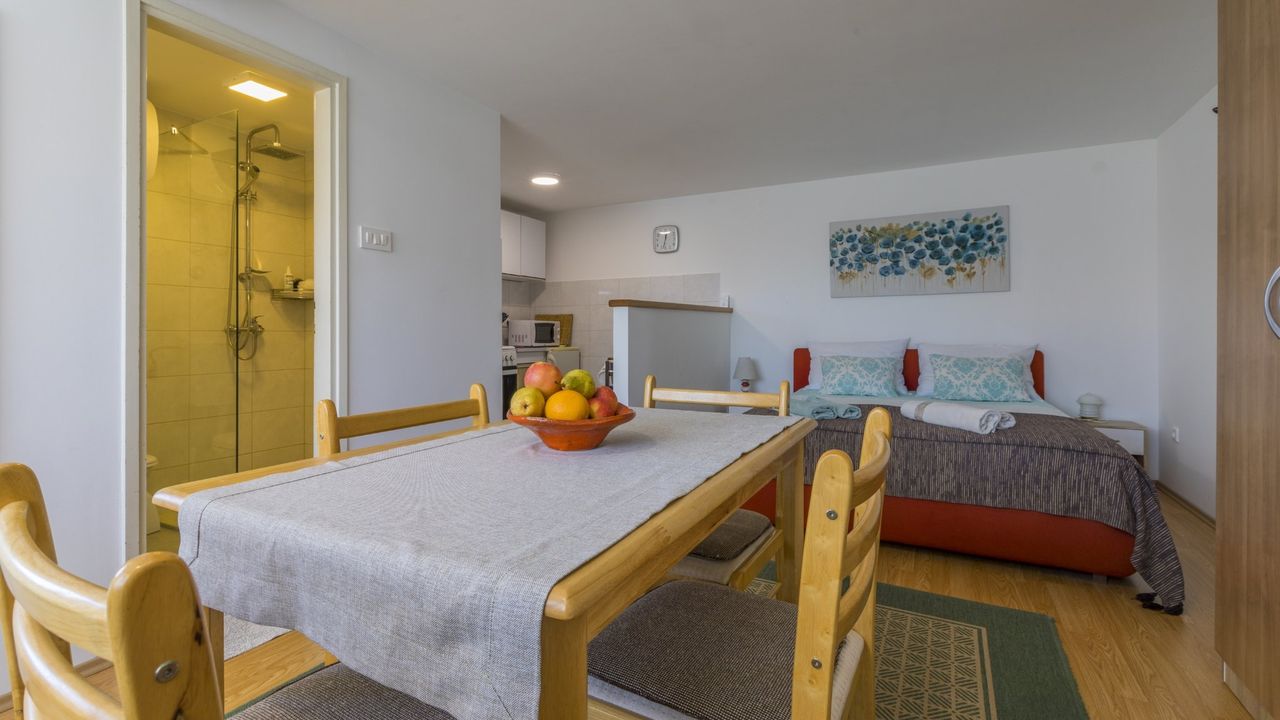 Dieses sch and ouml;ne Apartment, nur f and uuml;nf Minuten zu Fu and szlig; vom Meer und Strand entfernt, ist die perfekte Wahl f and uuml;r Paare oder G and auml;ste, die komfortable und praktische Unterkunft suchen. Das Apartment ist ein Studio, was bedeutet, dass das Schlafzimmer mit einem Doppelbett, das Wohnzimmer, der Essbereich und die K and uuml;che sich alle in demselben ger and auml;umigen Raum befinden, wodurch es ideal zum Entspannen und Genie and szlig;en jedes Moments ist.Das Badezimmer ist einfach, aber funktional, mit einer Dusche, einem Waschbecken und einer Toilette. Trotz der kleineren Gr and ouml; and szlig;e wird der Raum maximal genutzt und bietet alle notwendigen Annehmlichkeiten f and uuml;r einen komfortablen Aufenthalt.