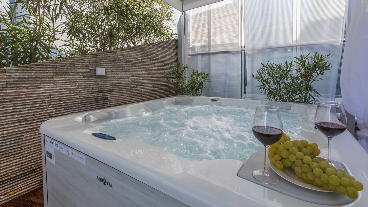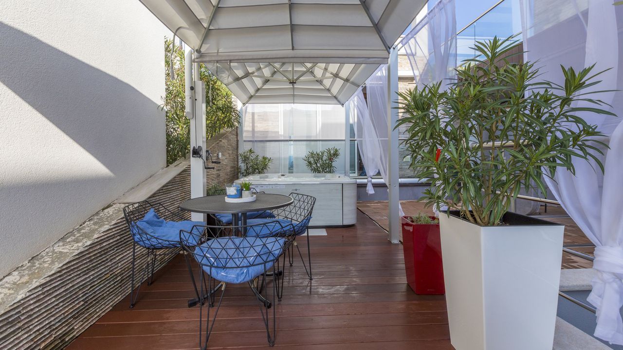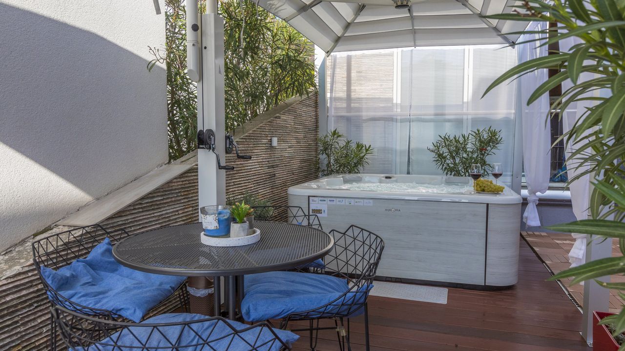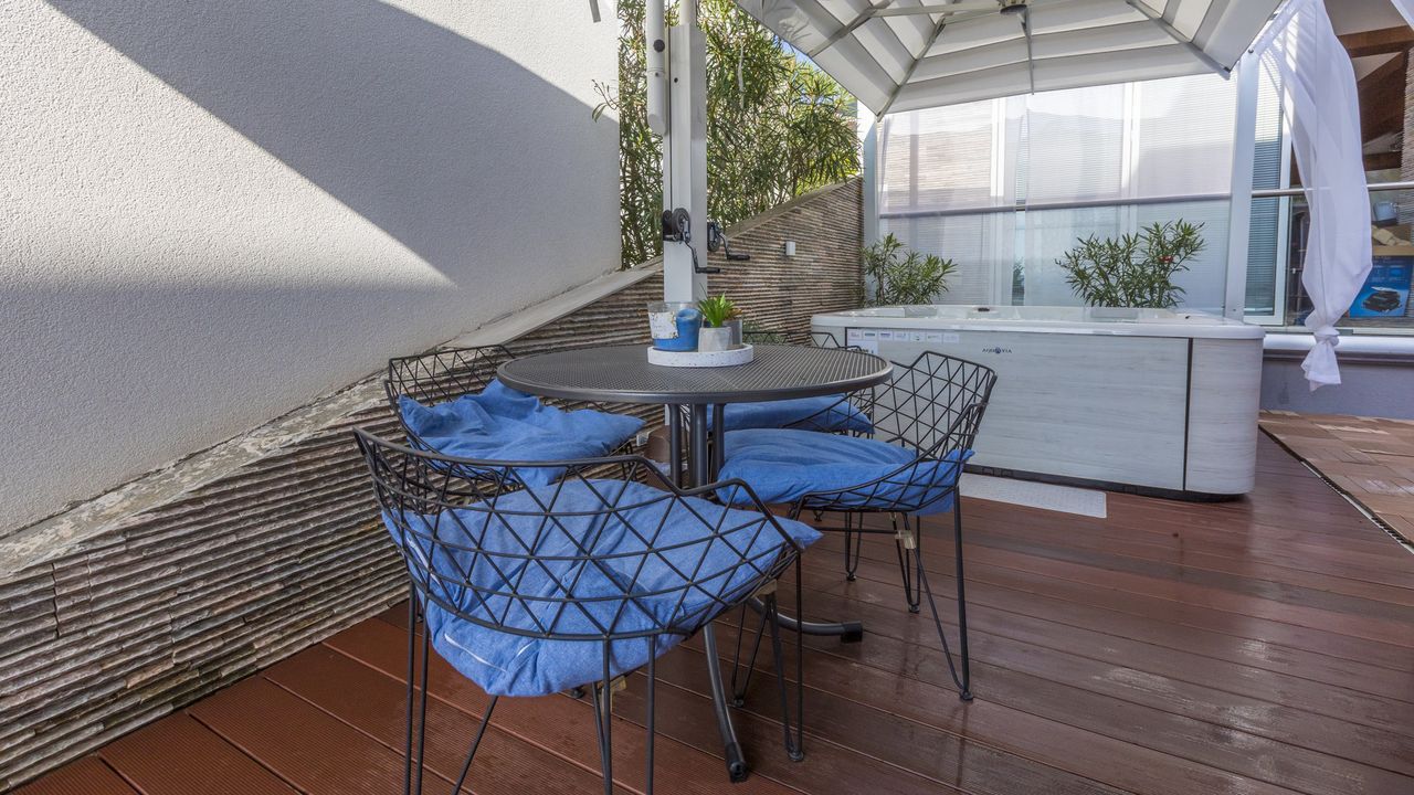 Die Terrasse dieses Apartments ist sehr bequem und stylisch eingerichtet. Ausser Tisch und St and uuml;hlen f and uuml;r vier Personen steht auf der Terasse ein eigener Gasgrill und ein eigener and nbsp;Whirlpool and nbsp;zur Verf and uuml;gung, welcher f and uuml;r bis zu vier Personen geeignet ist.