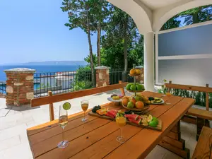 Diese ist sehr stylisch eingerichtet und besteht aus einem gem and uuml;tlichen Wohn/Esszimmer mit einer sehr gut ausgestattet K and uuml;che und zwei Schlafzimmern mit jeweils einem eigenem Badezimmer. Zu dieser Wohnung geh and ouml;rt eine eigene Terrasse welche vom Wohnbereich aus erreichbar ist. Diese ist and uuml;berdacht und verf and uuml;gt and uuml;ber einen Blick aufs Meer und die naheliegenden Inseln Krk und Rab.