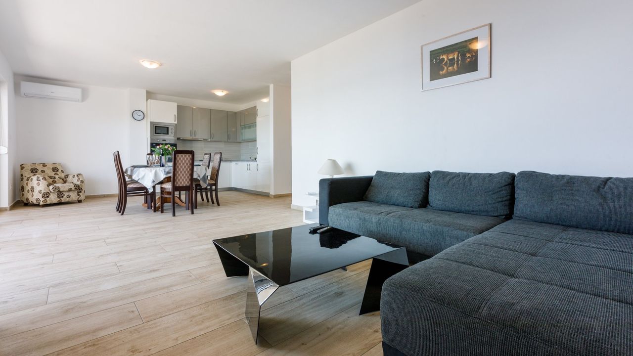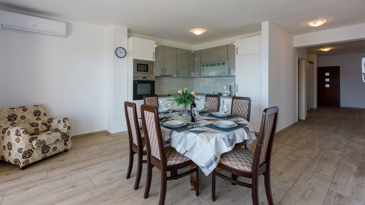 Zwei wundersch and ouml;n eingerichtete Apartments in Crikvenica, nur wenige Schritte vom ber and uuml;hmten Sandstrand Crni mol entfernt. Diese modernen und ger and auml;umigen Wohneinheiten bieten die perfekte Kombination aus Komfort, Funktionalit and auml;t und N and auml;he zu allen wichtigen Annehmlichkeiten.Das erste Apartment ist ger and auml;umig und durchdacht gestaltet. Es verf and uuml;gt and uuml;ber ein klimatisiertes Wohn- und Esszimmer, das mit einer modernen, voll ausgestatteten K and uuml;che verbunden ist. Die Wohnung umfasst drei klimatisierte Schlafzimmer, jedes mit eigenem Bad, was den G and auml;sten maximale Privatsph and auml;re bietet. Vom Flur aus gelangt man auf einen sch and ouml;nen Balkon von 20 m and sup2;, der einen atemberaubenden Meerblick bietet.
