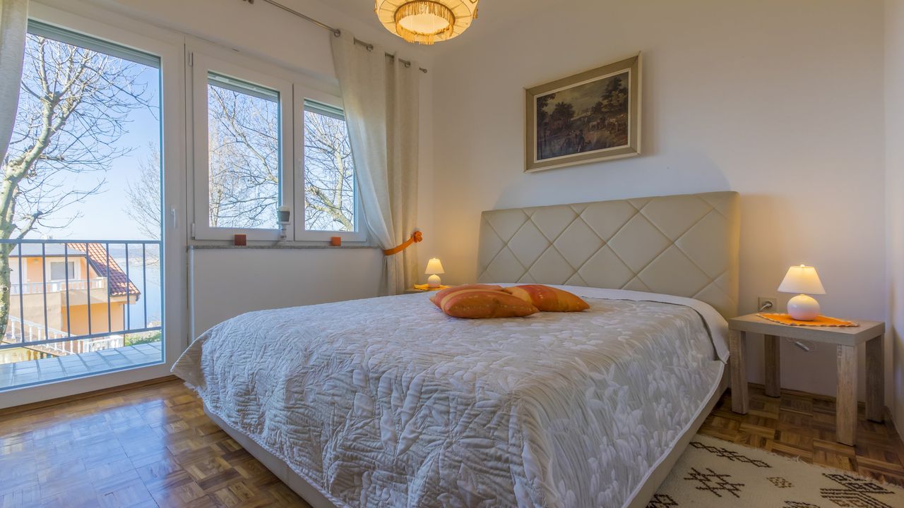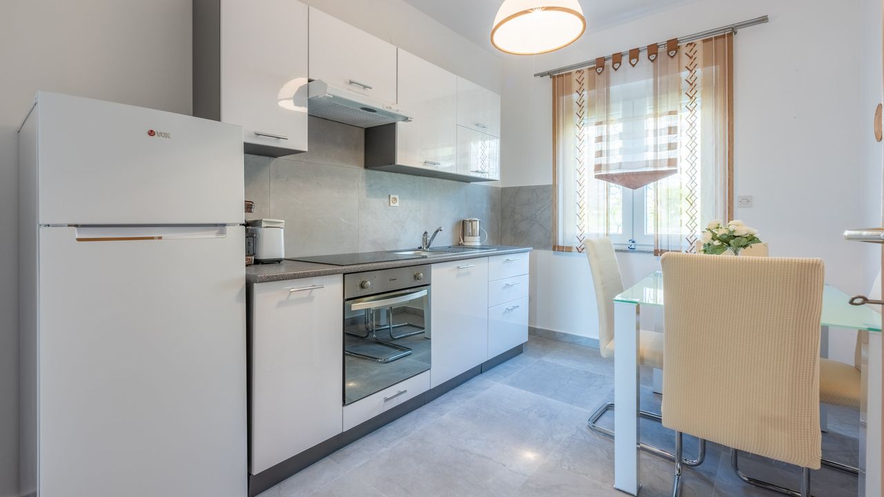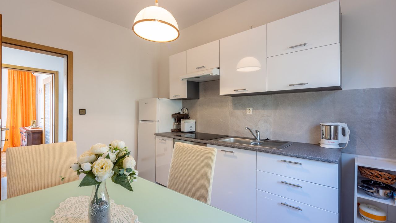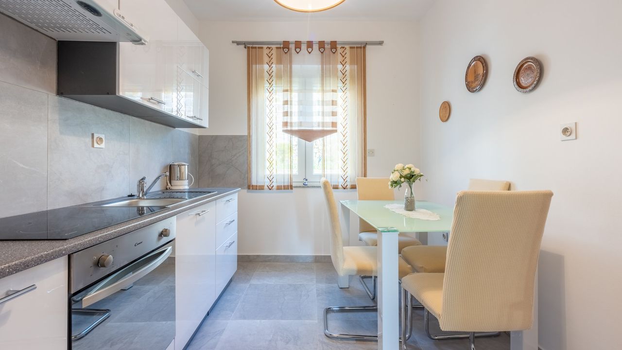 Nicht weit vom Meer und den ruhigen Buchten der Halbinsel Kačjak entfernt, erwartet Sie diese wundersch and ouml;ne Ferienwohnung, die f and uuml;r bis zu sechs Personen geeignet ist und zudem mit einem Swimmingpool ausgestattet ist. Die Wohnung verf and uuml;gt and uuml;ber ein gem and uuml;tliches Wohn- und Esszimmer mit Meerblick und Zugang zum Balkon, zwei Schlafzimmer, ein Badezimmer sowie einen Flur. and nbsp;Ein weiteres Highlight ist der eigene Balkon sowie eine gro and szlig;z and uuml;gige Terrasse, die sich im Garten befindet und mit einem Grill ausgestattet ist and ndash; perfekt f and uuml;r gesellige Abende im Freien. Im Au and szlig;enbereich k and ouml;nnen Sie auf einer and uuml;berdachten Terrasse mit einem Tisch und St and uuml;hlen f and uuml;r sechs Personen entspannen, w and auml;hrend Sie den sch and ouml;nen Blick und die Ruhe genie and szlig;en. Der 32 m and sup2; gro and szlig;e Swimmingpool bietet Erfrischung an warmen Tagen, und rund um den Pool stehen Ihnen sechs Sonnenliegen sowie eine Liegewiese zur Verf and uuml;gung, um in der Sonne zu entspannen. and nbsp;