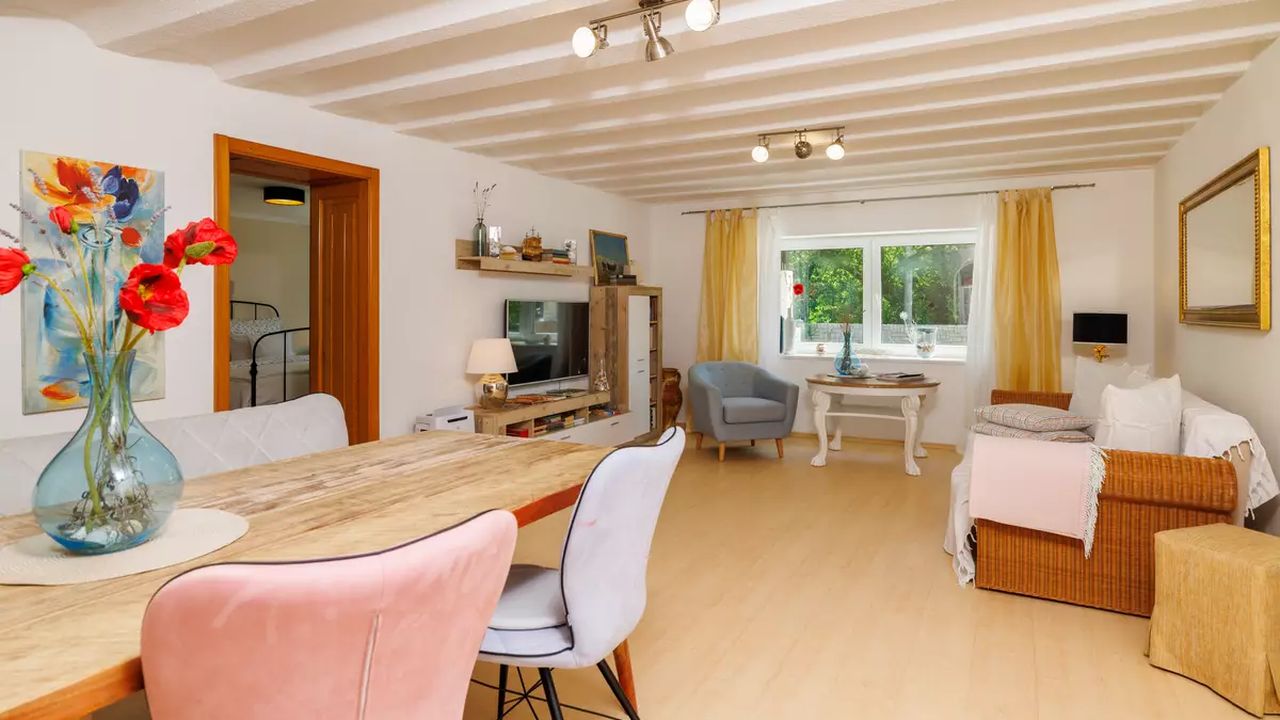 In einer ruhigen und idyllischen Umgebung befindet sich diese sch and ouml;ne Haus in welchem 2 Ferienwohnungen vermietet werden. Es wird eine Wohnung im 1. Obergescho and szlig; und diese im Erdgescho and szlig; angeboten, welche f and uuml;r bis zu 6 Persohnen vorgesehen ist.Die Wohnung verf and uuml;gt and uuml;ber ein Wohn/Esszimmer, eine gut ausgestattete K and uuml;che, drei Schlafzimmer und ein sehr gem and uuml;tliches Badezimmer.