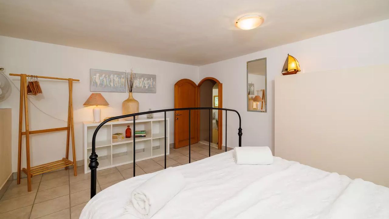 Zwei Schlafzimmer sind mit Doppelbetten ausgestattet und das dritte mit einem Einzelbet. Das dritte Schlafzimmer ist offen zum Wohnbereich und kann mit einer Gardiene abgedunkelt werden.