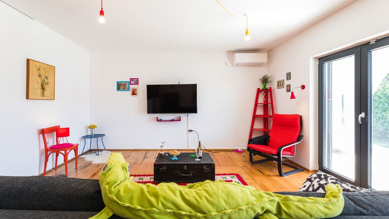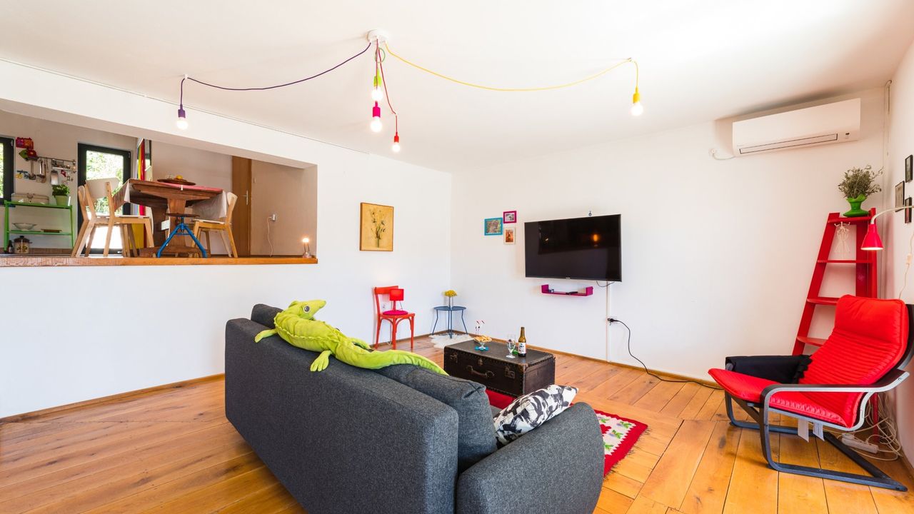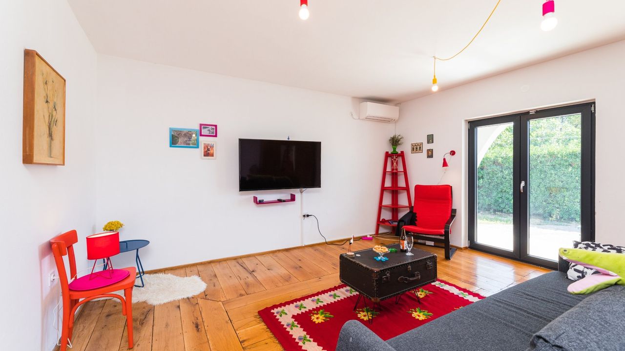 Im klimatisierten Erdgescho and szlig; befindet sich ein ger and auml;umiges Wohnzimmer mit Zugang zu einer zum Teil and uuml;berdachten Terrasse (Vorderseite). Hier befindet sich eine Schlafcouch welche ideal f and uuml;r 2 Kinder geeignet ist. Im Wohnzimmer steht ein gro and szlig;er SMART-TV Fernseher mit SAT-TV anschlus zur Verf and uuml;gung.