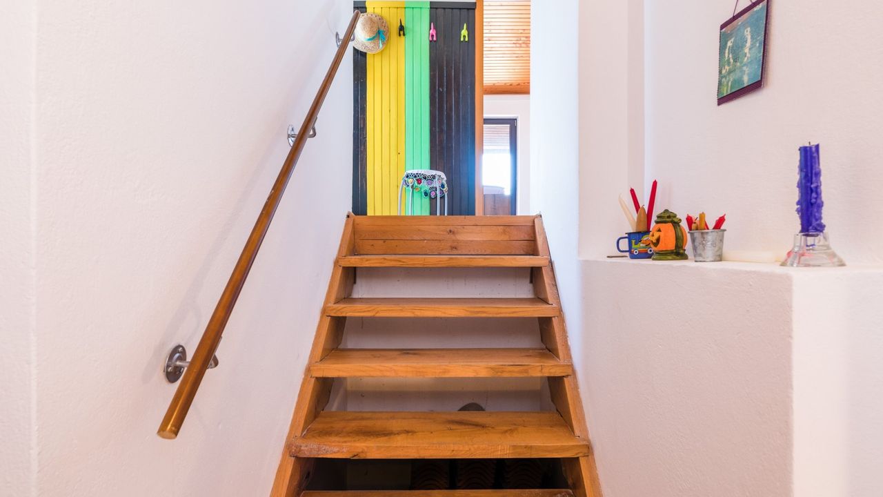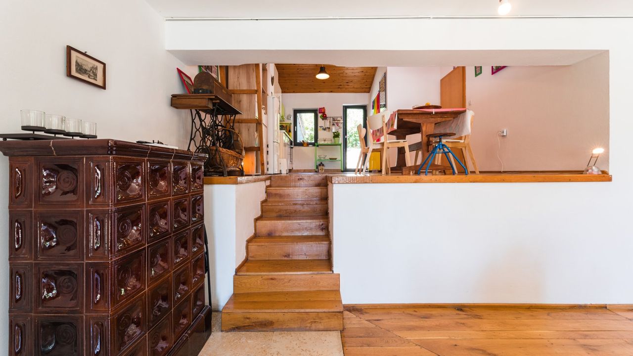 Vom Wohnzimmer f and uuml;hrt eine Treppe mit 7 Stufen zur Mitteletage, direkt in die K and uuml;che und den Essbereich des Hauses. Aus der K and uuml;che f and uuml;hrt eine T and uuml;r zur Hinterseite des Hauses und die hinterliegende Terrasse. Des weiteren befinden sich auf der mittleren Etage 2 Badezimmer, eine separate Toilette und der Eingangsbereich/Flur. Ein Badezimmer befindet sich im K and uuml;chenbereich und ist nicht durch eine klassische T and uuml;r, sondern durch Vorh and auml;nge getrennt.