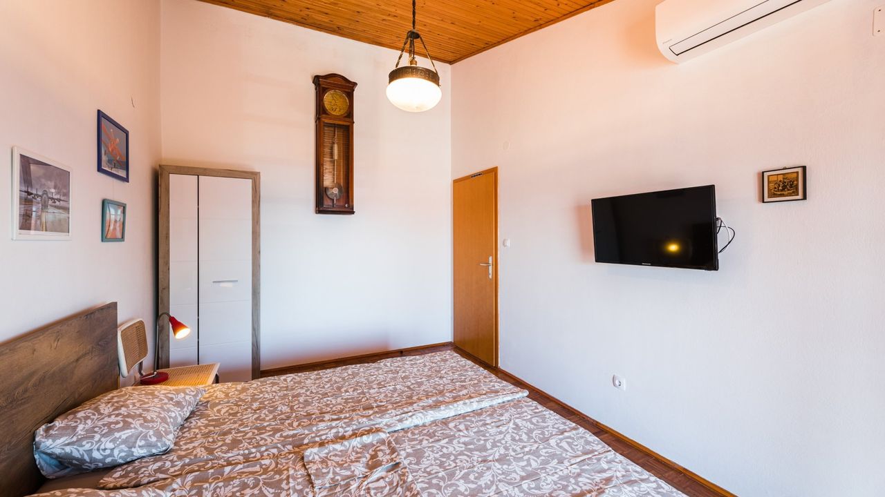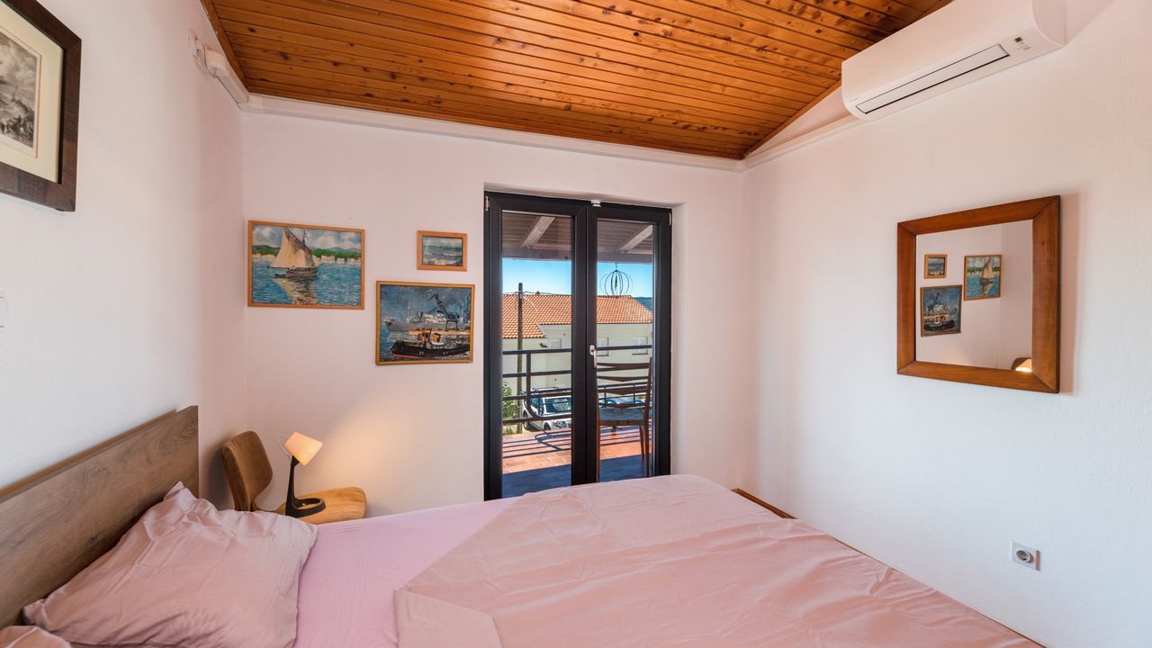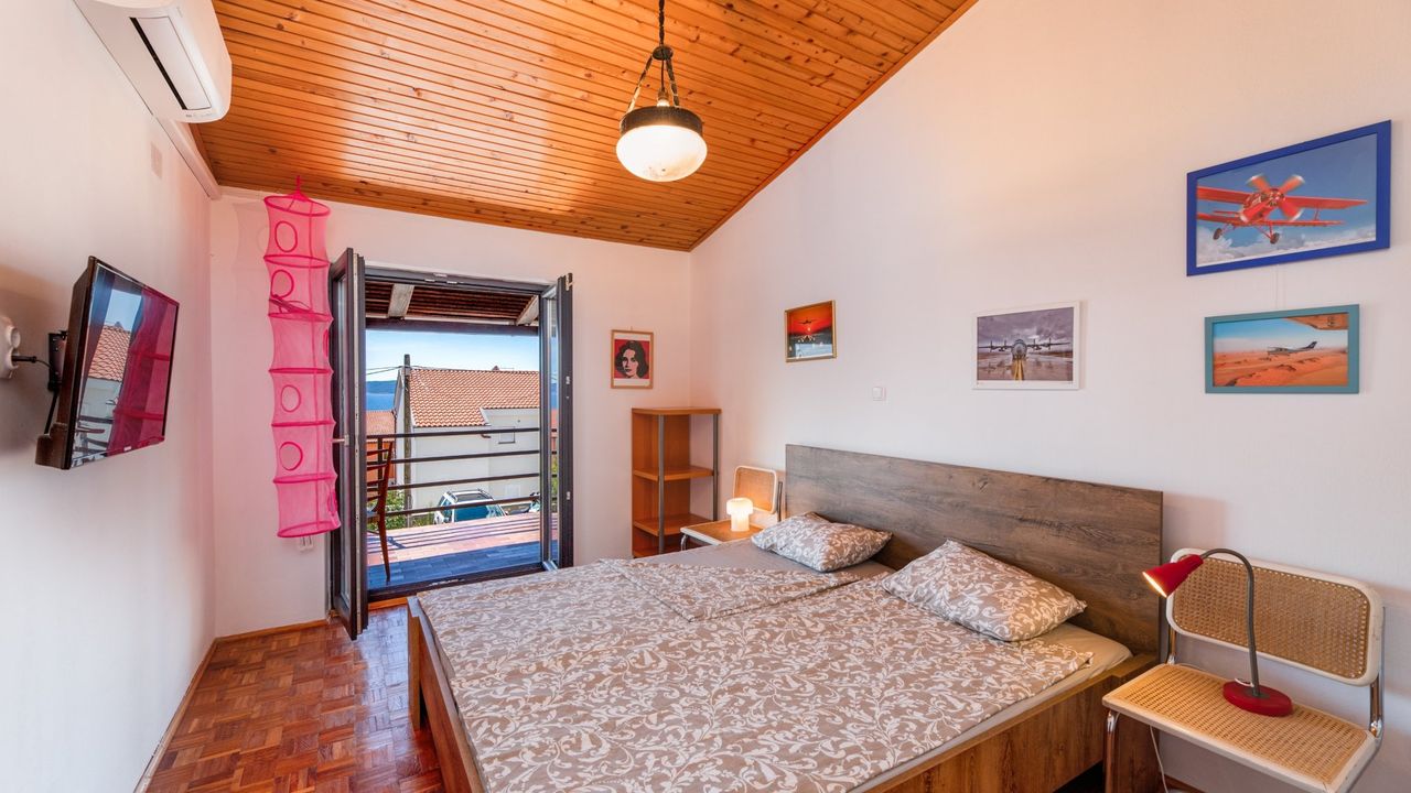 Vom Flur aus f and uuml;hren 7 weitere Stufen auf das erste Obergescho and szlig; in welchem sich zwei Schlafzimmer befinden. Beide Schlafzimmer sind klimatisiert, verf and uuml;gen and uuml;ber einen Meerblick, haben Zugang zum Balkon und verf and uuml;gen jeweils and uuml;ber ein Doppelbett. Ein Schlafzimmer ist mit einem SMART-TV Fernseher mit SAT-TV anschlus ausgestattet.
