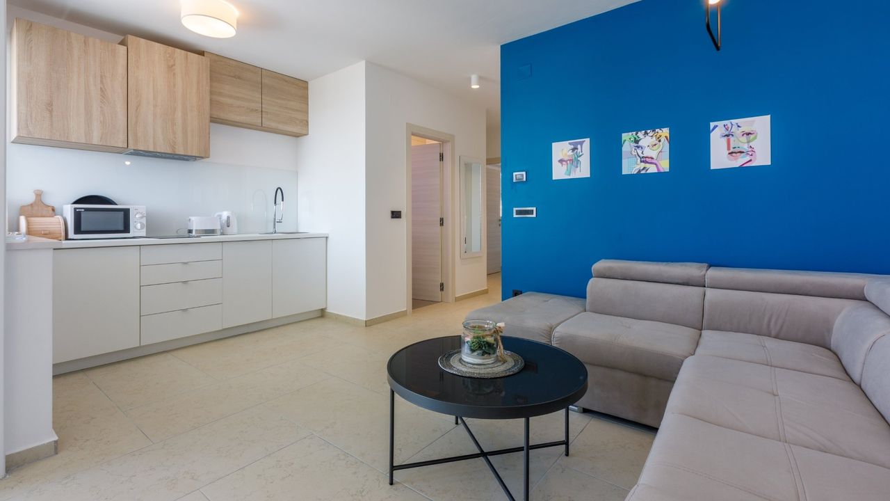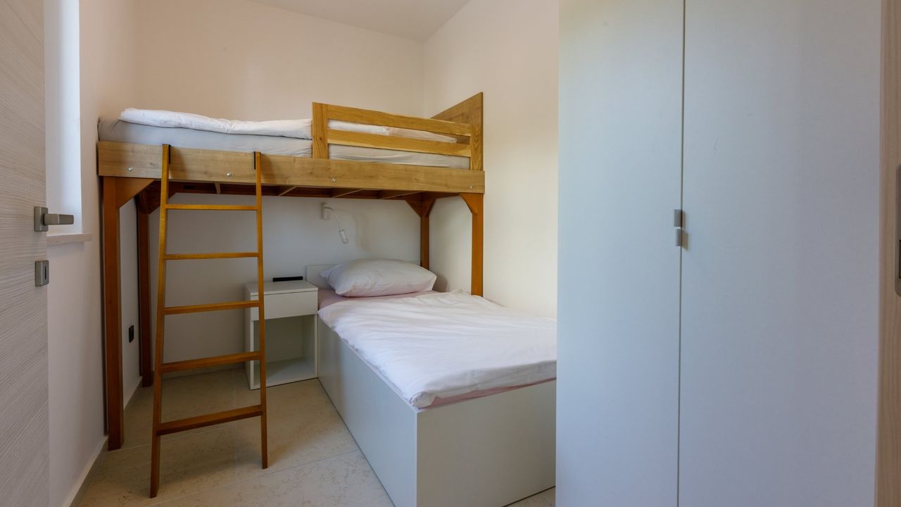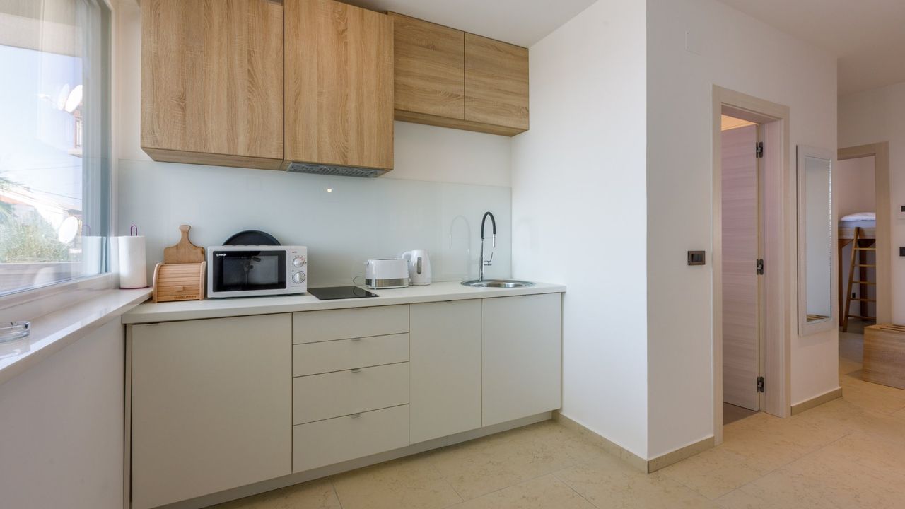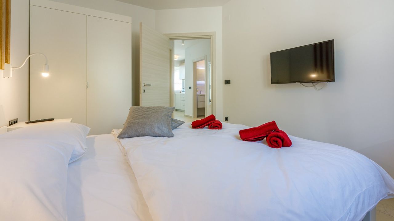 Diese Wohnung besteht aus einem ger and auml;umigen Wohn/Esszimmer mit einer gut ausgestatteten K and uuml;che, einem Schlafzimmer mit einem Doppelbett, einem Schlafzimmer mit zwei getrennten Einzelbettetn, einem modernen Badezimmer und einer separaten Toilette mit Waschbecken. Im Wohnzimmer befindet sich eine ausziehbare Schlafcouch welche f and uuml;r bis zu 2 Kinder vorgesehen ist. Aus dem Wohnbereich, welcher and uuml;ber einen Meerblick verf and uuml;gt hat man einen direkten Zugang zum Balkon dieser Ferienwohnung.Hinter dem Haus befindet sich ein traumhafter Poolbereich mit einem 32 m and sup2; gro and szlig;en und 1,6 m tiefen Swimmingpool. Gleich daneben steht eine Sauna, einige Sportger and auml;te und eine Bar zur Verf and uuml;gung.