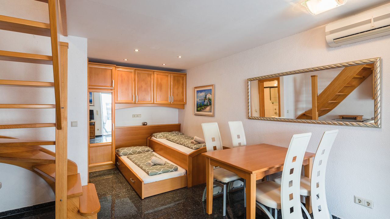 Im Erdgescho and szlig; befindet sich die K and uuml;che mit Essbereich, einem offenem Schlafbereich f and uuml;r 2 Personen und einer separaten Toilette.Auf dem Obergescho and szlig; befindet ein Schlafzimmer mit einem Badezimmer. Vom Schlafzimmer hat man Zugang zur eigenen Dachterrasse. Aus der unteren Etage kommt man direkt zum Poolbereich mit einer gem and uuml;tlichen Terrasse.