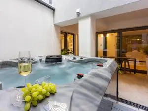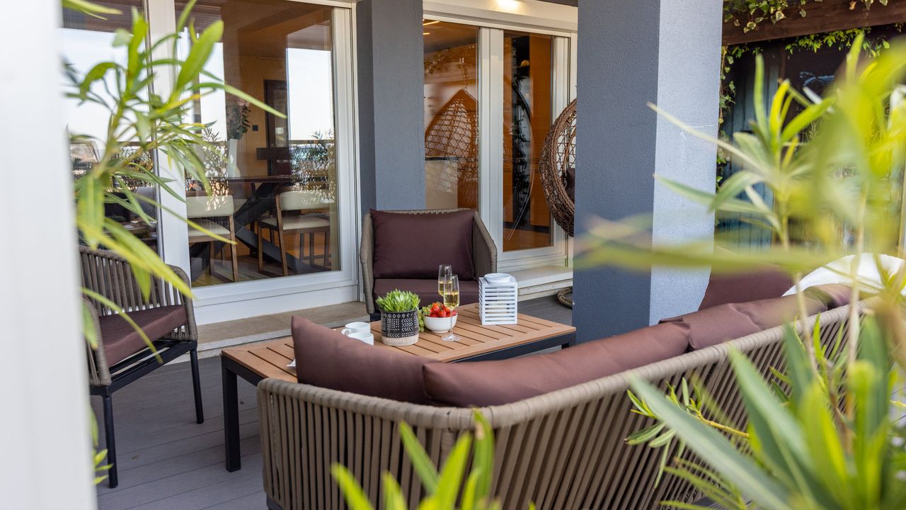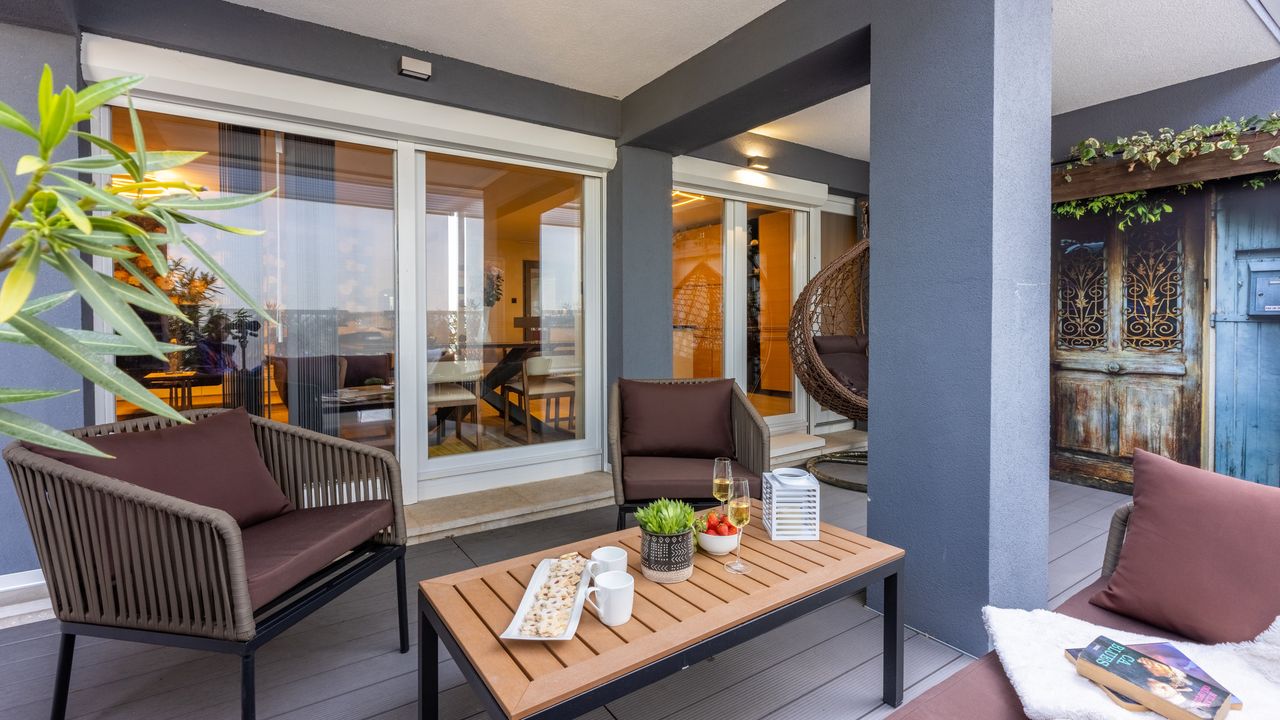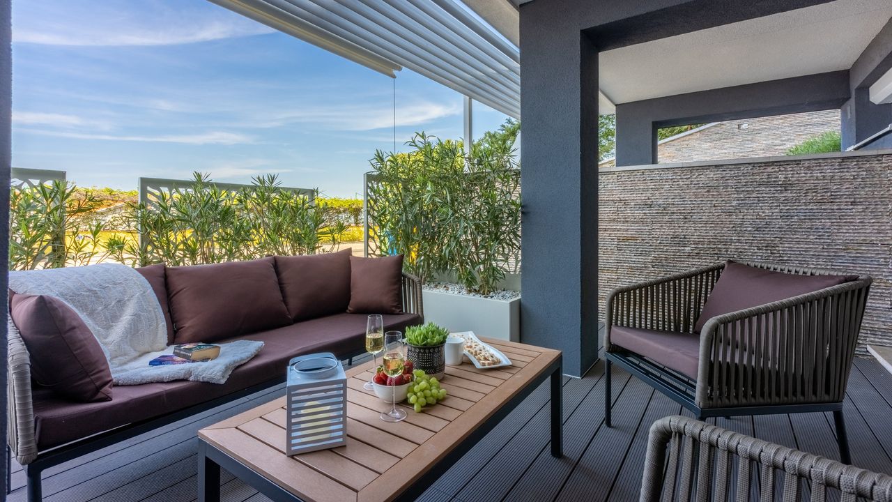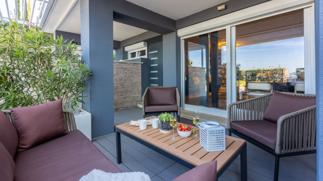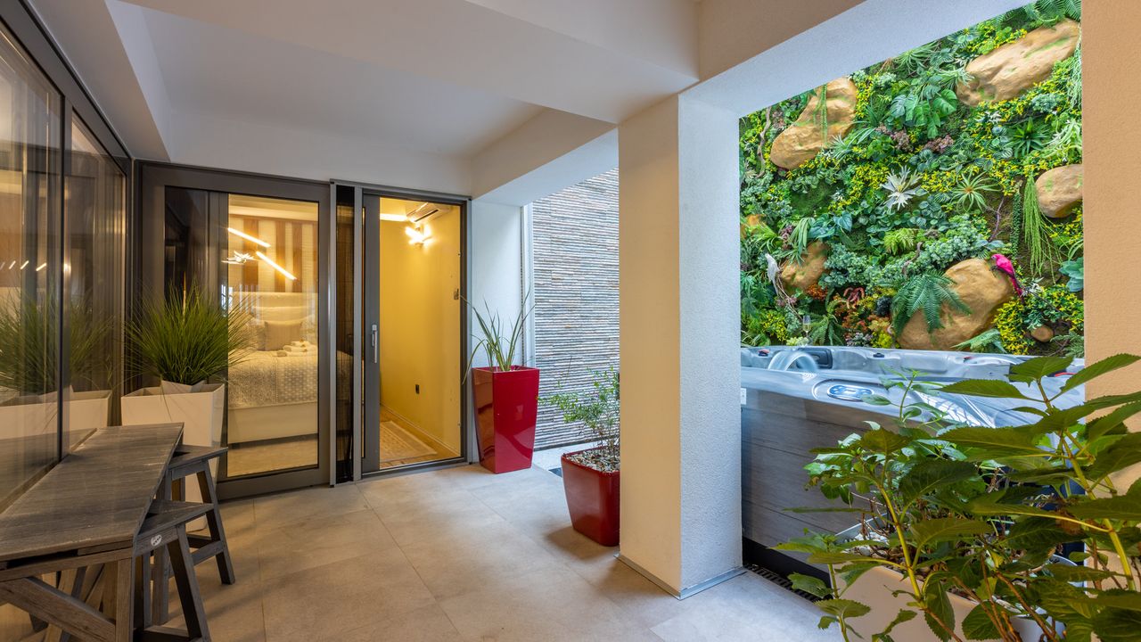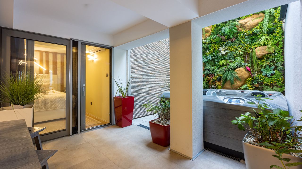 Die Terrasse dieses Apartments ist sehr bequem und stylisch eingerichtet mit Tisch und Lounge Sessel f and uuml;r vier bis 6 Personen. Ausser der steht im Atrij ein eigener Gasgrill und ein eigener Whirlpool zur Verf and uuml;gung, welcher f and uuml;r bis zu vier Personen geeignet ist. Das Atrij ist von beiden Schlafzimmer zug and auml;nglich.
