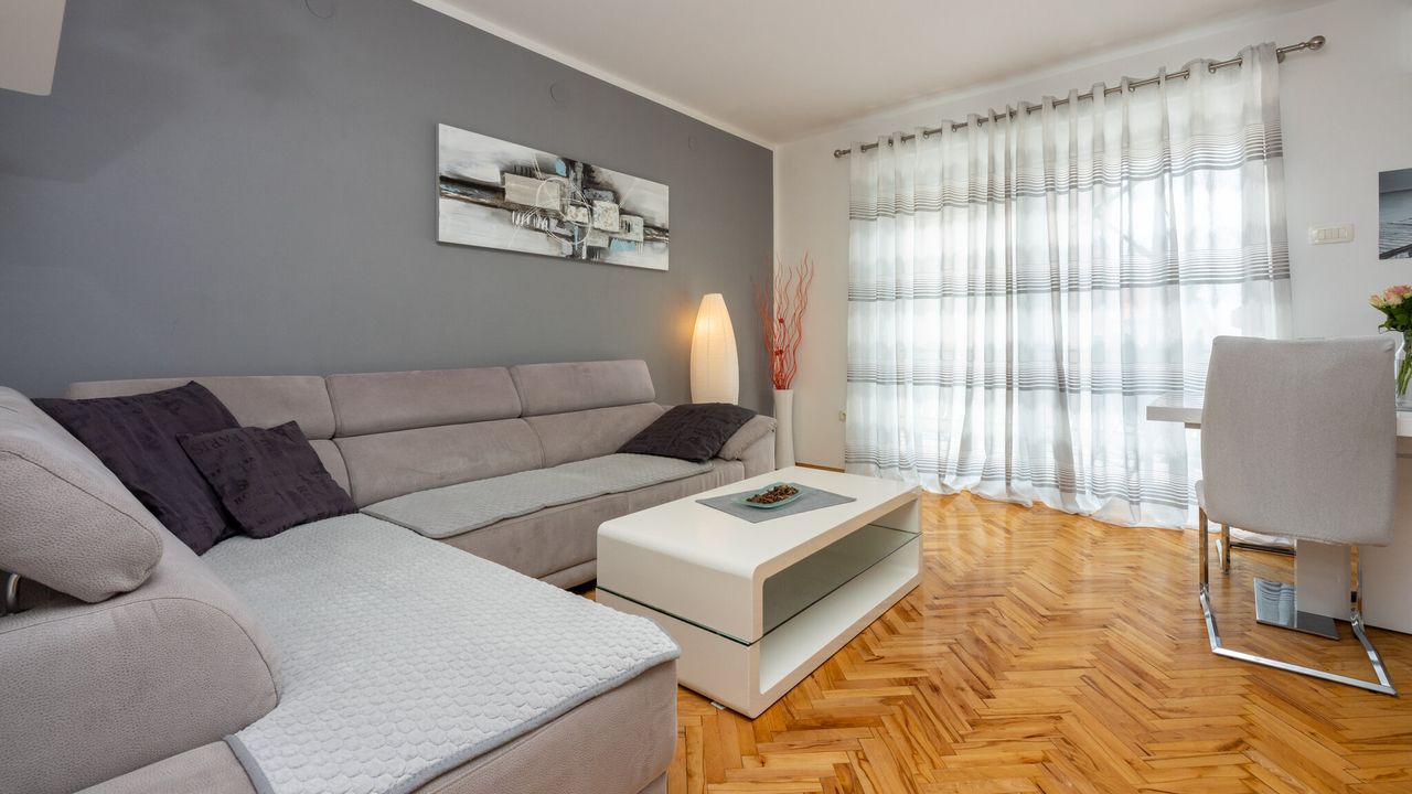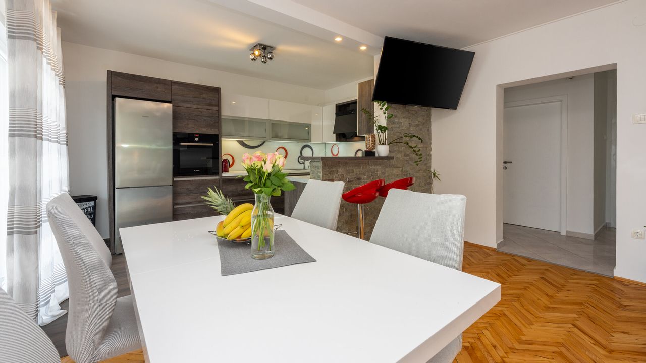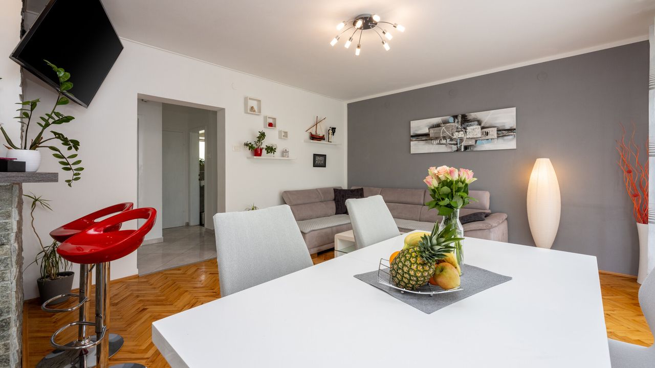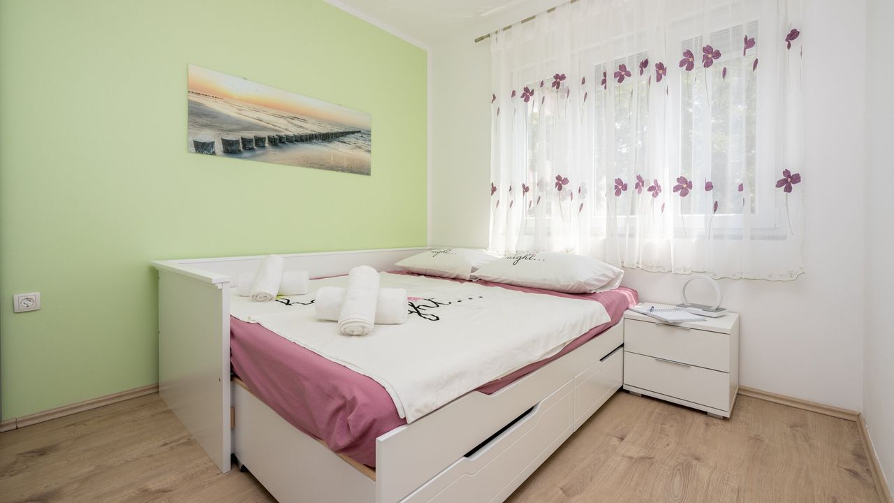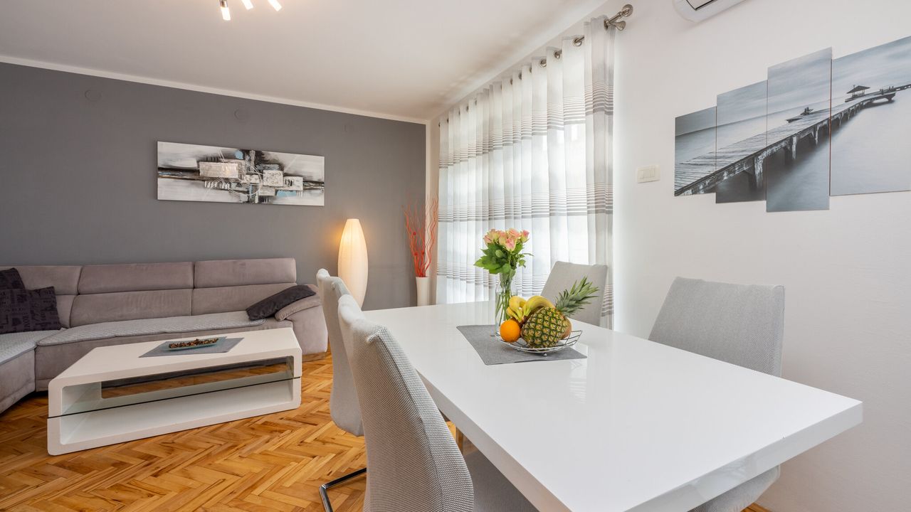 Dieses wundersch and ouml;ne und modern eingerichtete Ferienapartment, geeignet f and uuml;r 2 bis 4 Personen, befindet sich im Herzen der Kvarner Bucht, in einem der beliebtesten Urlaubsorte and ndash; Crikvenica. Dank seiner idealen Lage bietet dieses Apartment die perfekte Kombination aus ruhiger Umgebung und der N and auml;he zu allen wichtigen Attraktionen, Annehmlichkeiten und den wundersch and ouml;nen Str and auml;nden, die diese charmante K and uuml;stenstadt zu bieten hat.Das Apartment liegt im ersten Stock eines Familienhauses und wurde so gestaltet, dass es den G and auml;sten maximalen Komfort und Bequemlichkeit w and auml;hrend ihres Aufenthalts bietet. Sein modernes und funktionales Design umfasst ein ger and auml;umiges Wohnzimmer, das mit dem Essbereich und einer voll ausgestatteten K and uuml;che verbunden ist, was den G and auml;sten die M and ouml;glichkeit gibt, eigene Mahlzeiten zuzubereiten und zu genie and szlig;en. Au and szlig;erdem verf and uuml;gt es and uuml;ber zwei gem and uuml;tliche Schlafzimmer, ein modernes Badezimmer, eine separate Toilette und einen Flur, der alle R and auml;ume verbindet.