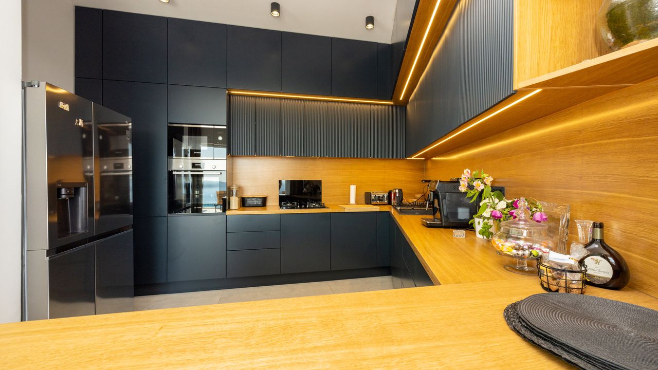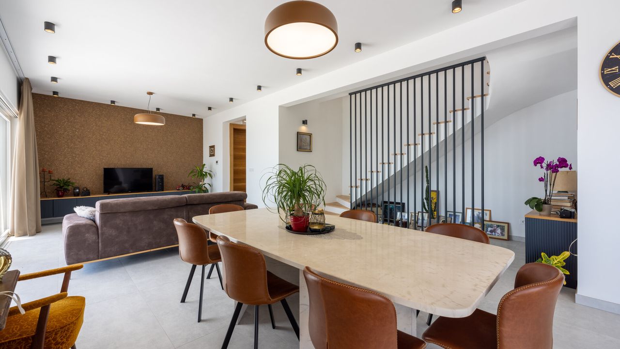 Das Erdgeschoss mit direktem Zugang zum Pool und zur Terrasse besteht aus einem ger and auml;umigen Wohn- und Essbereich, einer gut ausgestatteten K and uuml;che und einem separaten WC. Gro and szlig;e Glasfl and auml;chen lassen viel Tageslicht herein und schaffen eine harmonische Verbindung zum Au and szlig;enbereich.