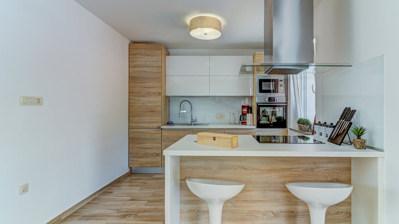 Wohn/Esszimmer und K and uuml;che sind ein Raum, Schlafcouch f and uuml;r zwei Personen, SAT-TV, Balkon, Terrasse, Fliesen