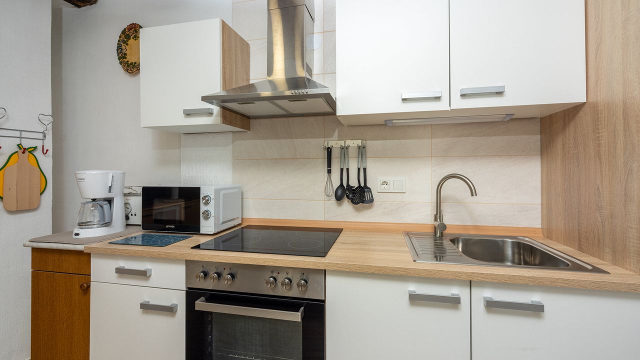 Geschirr, K and uuml;chenhandt and uuml;cher, Elektroherd, Kochplatten: 4, Backr and ouml;hre, K and uuml;hlschrank mit Gefrierfach, Filterkaffeemaschine, Mikrowelle, Toaster