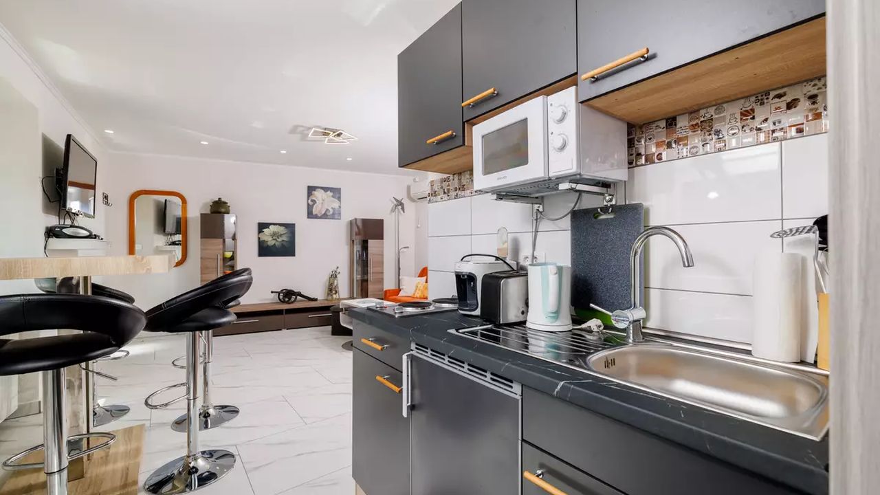 Wohn/Esszimmer und K and uuml;che sind ein Raum, Schlafcouch f and uuml;r zwei Personen, Terrasse, Fliesen, Sat-TV