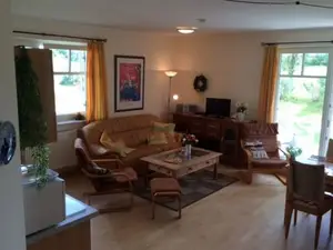 Das Wohnzimmer ist sehr bequem mit Sitz- und Essecke, Sat-TV, Stereoanlage-CD eingerichtet. Eine komplett eingerichtete Küchenzeile ,E-Herd,Toaster, Geschirrspüler, Mikrowelle, Wasserkocher, Kaffeemaschine, Bosch Tassio Kaffemaschine usw. Auf der Gartenterrasse mit Sitzmöbeln können Sie einen herrlichen Blick auf den Garten und die Düne mit Promenade genießen. Direkter Zugang durch den Garten zum eigenen Strandzugang und den Strandkörben. Für Familien mit Kindern. Haustiere erlaubt !