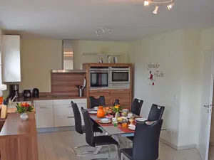 Unsere offene Küche im Wohn/Essbereich ist komplett ausgestattet, dazugehört ein separater Backofen, eine große Mikrowelle, eine Wärmeschublade und ein eigener Gefrierschrank. Wir haben unsere Küche wie wir finden gut ausgestattet :-) Es sollten alle Geräte vorhanden sein, die man zum kochen und backen benötigt. Lebensmittel wie Öl und Gewürze können wir aber nicht zur Verfügung stellen.Eine Waschmaschine und einem Trockner können Sie in den Sommermonaten bei der Rezeption gegen eine Gebühr nutzen.