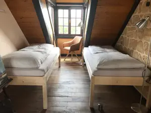 Direkt am Dorfteich gelegenes Rittergut im mediterranem Stil neu erbaut. Die hundefreundliche Ferienwohnung Turmzimmer besitzt 50 m² und ist ausgestattet mit Bad, Flur, Küche, Wohnzimmer und Schlafraum mit 4 Einzelbetten. Eine Babybett für ein Kleinkind ist zusätzlich vorhanden. Erleben Sie den vermutlich einmaligen Neubau eines Rittergutes.Das Turmzimmer ist ein Rückzugsort für sinnliche Stunden. Dafür sorgt auch ein weitreichender Rundblick über den Dorfteich und die angrenzende Umgebung. Hier wurde gerne musiziert und gemalt. Sie erkennen das leicht an einigen zurückgelassenen Instrumenten. Auch die eine oder andere Staffelei finden Sie in den Gemächern. Kurzum hier ist Kunst und Stil zu Hause.