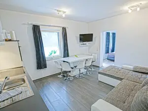 Dieses Wunderschöne Ferienhaus für 1-5 P. liegt als Nebengebäude auf dem 1800qm großen Grundstück mit 3 weiteren Apartments, wo von Sie ca.: 350qm zur eigenen Nutzung haben und ist vollständig ebenerdig aber mit Stufen, es wurde 2022 komplett neu saniert worden. Genießen Sie einen erholsamen Urlaub in einer modern eingerichteten Ferienhausapartment auf ca. 82 m², die hohen Ansprüche an einen komfortablen Urlaub erfüllt und es Ihnen an nichts fehlen wird. Die Wohnfläche unterteilt sich in zwei Schlafzimmer mit je einem Doppelbett (180 cm x 200 cm), das von zwei beidseitigen Nachttischen mit Leselampen umgeben ist, sowie einem Einzelbett ( 0,90 cm x 190 cm) für hohen Komfort. Vor dem Doppelbett steht stets ein geräumiger Kleiderschrank mit Spiegeltüren, der ausreichend Verstauungsmöglichkeiten für Ihr Reisegepäck bietet. Herzstück der Wohnung ist der 23 m² umfassende Wohnbereich mit integrierter Küchenzeile und einen bequemen Essplatz. Auf der ausziehbaren Couch entspannen Sie nach einem Tagesausflug während der Flachbildfernseher mit Sat.-TV und TV-USB-Anschluss für Unterhaltung sorgt. Ein prasselndes Feuer im Kaminofen sorgt auch in der kalten Jahreszeit für behagliche Wärme und ein besonders gemütliches Ambiente. Im ausgezogenen Zustand bietet die Couch zwei Personen einen bequemen Schlafplatz mit einer Liegefläche von 194 cm x 235 cm. Die offene Küche ermöglicht Ihnen eine umfangreiche Selbstversorgung anhand eines Vierzonenkochfelds, eines Backofens, eines Kühlschranks mit Gefrierfach, sowie zahlreicher Kleinelektrogeräte, von einem Toaster über eine Mikrowelle bis zur Kaffeemaschine. Zu gemeinsamen Speisen nehmen Sie Platz im ansehnlichen Essbereich auf fünf komfortablen Schwingstühlen. Im Badezimmer ist eine Duschkabine, ein Handwaschbecken mit WC und Handtuchtrockner, sowie ein Badezimmerfenster vorhanden. Genießen sie im Ferienhausapartment eine sehr angenehme Fußbodenheizung die auch in der kalten Jahreszeit für angenehme Temperaturen sorgt. Für einen romantischen Flair sorgt auch der knisternde Kamin der zusätzlich auch zum Heizen genutzt werden kann.