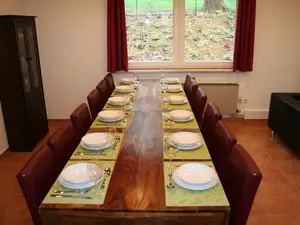 Der große massive Holztisch und die bequemen Polsterstühle laden zum gemeinsamen Beisammensein ein. Sei es zum Einnehmen für gemeinsame Mahlzeiten aber auch für gemütliche Spieleabende Feierlichkeiten auch gern im größeren Kreis.