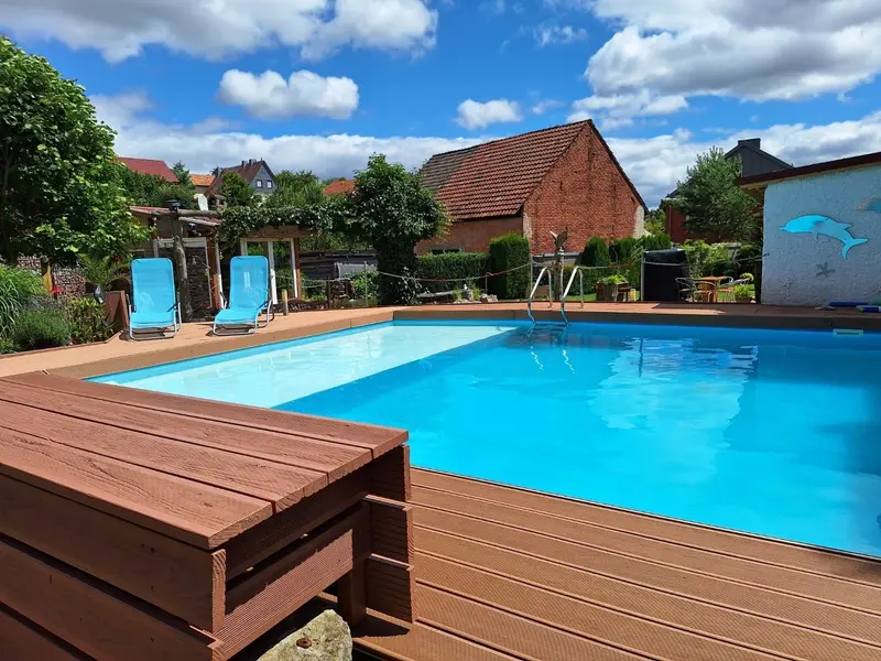 Im Garten finden unsere Gäste einen großen solarbeheizten Pool in 3 verschiedenen Tiefen. Ein Grillhaus mit Kamin ist Garant für wunderschöne Stunden zum Tagesausklang. Der Garten wird in der Nacht besonders romantisch beleuchtet.