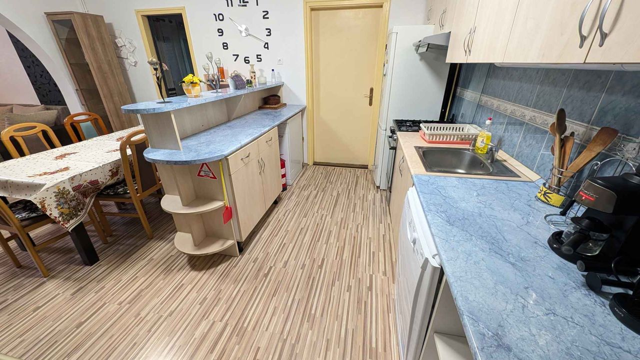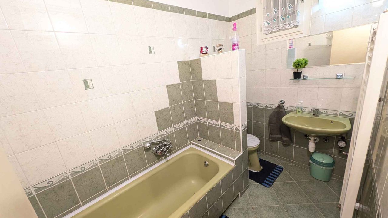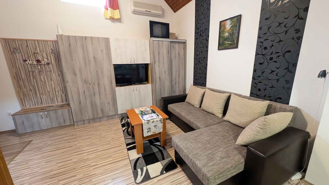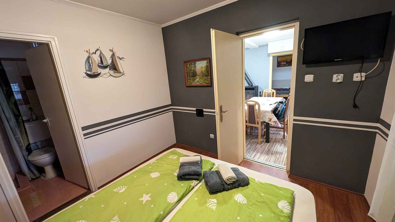 Der Eingang in Ihr Ferienhaus befindet sich im Erdgeschoss, ist ebenerdig und führt über die 10 qm große Terrasse direkt in das Wohnzimmer. Wohnzimmer (30 qm) mit 2 Zusatzbetten auf Doppelausziehcouch, Sitzecke, TV, Kamin und Zugang zur Terrasse (10 qm, überdacht, Gartenmöbel, 1 Tisch, 2 Stühle). Alle Fenster und Außentüren sind mit Fliegengittern gesichert. Schlafzimmer (20 qm) mit 1 Doppelbett (Kingsize) und TV. Alle Fenster und Außentüren sind mit Fliegengittern gesichert. Schlafzimmer (20 qm) mit 2 Einzelbetten, TV und Zugang zur Loggia. Alle Fenster und Außentüren sind mit Fliegengittern gesichert. Amerikanische Küche mit TV, Essecke (6 Plätze), Elektroherd (4 Platten), Backofen, Dunstabzugshaube, Geschirrspüler, Kühlschrank (120 l, Eisfach), Mikrowelle, Kaffeemaschine, Kapselmaschine und Zugang zur Terrasse. Alle Fenster und Außentüren sind mit Fliegengittern gesichert. Bad (10 qm) mit Badewanne, 1 Waschbecken, WC, Föhn und Fenster. Alle Fenster und Außentüren sind mit Fliegengittern gesichert. Bad (4 qm) mit Dusche, 1 Waschbecken, WC und Ventillátor.