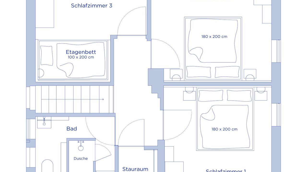 Im Obergeschoss befinden sich drei gemütliche Schlafzimmer. Zwei Schlafzimmer sind jeweils mit Doppelbetten ausgestattet, das dritte Schlafzimmer verfügt über ein Etagenbett, welches auch von erwachsenen Personen bequem genutzt werden kann. Das Badezimmer mit Fenster ist mit einer Dusche ausgestattet.