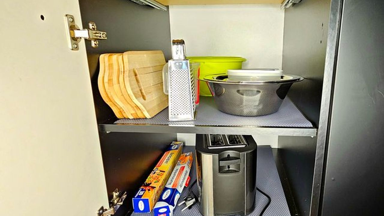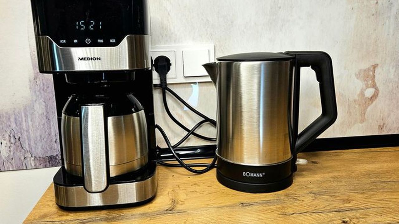 Teekanne mit Stövchen, Toaster, Wasserkocher und Kochutensilien.