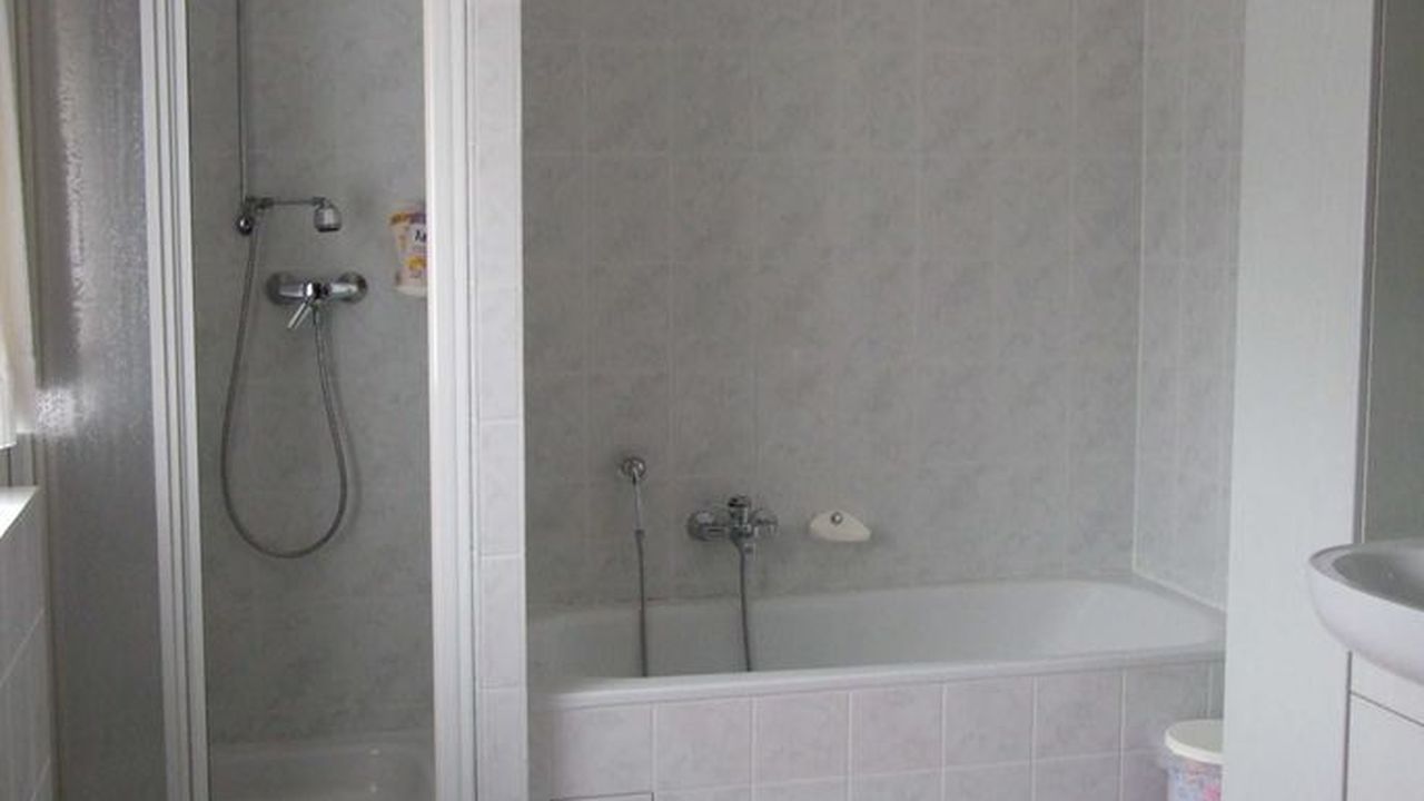 Wohnzimmer, 1 Schlafzimmer mit 1 Einzelbett und 1 Schrankbett, Küche, Bad mit Dusche und Wanne