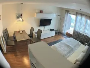 Wohn/Schlafraum: Esstisch mit 4 Stühlen, Doppelbett (2,0 x 1,8 m), 2 bequeme Sessel, großer Flachbildfernseher mit SAT – Programmen (Astra)