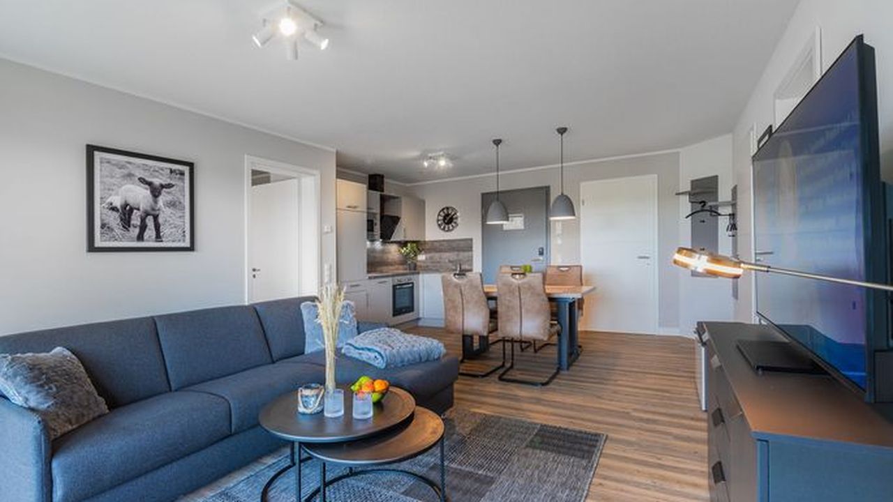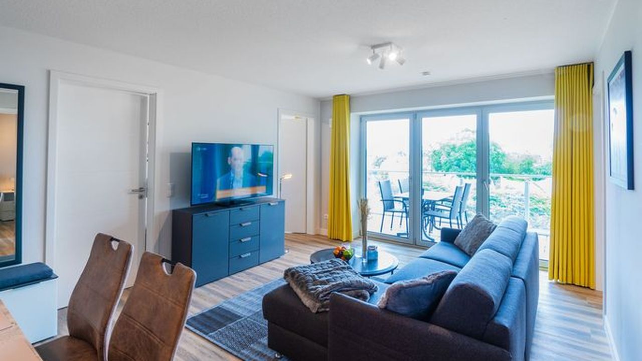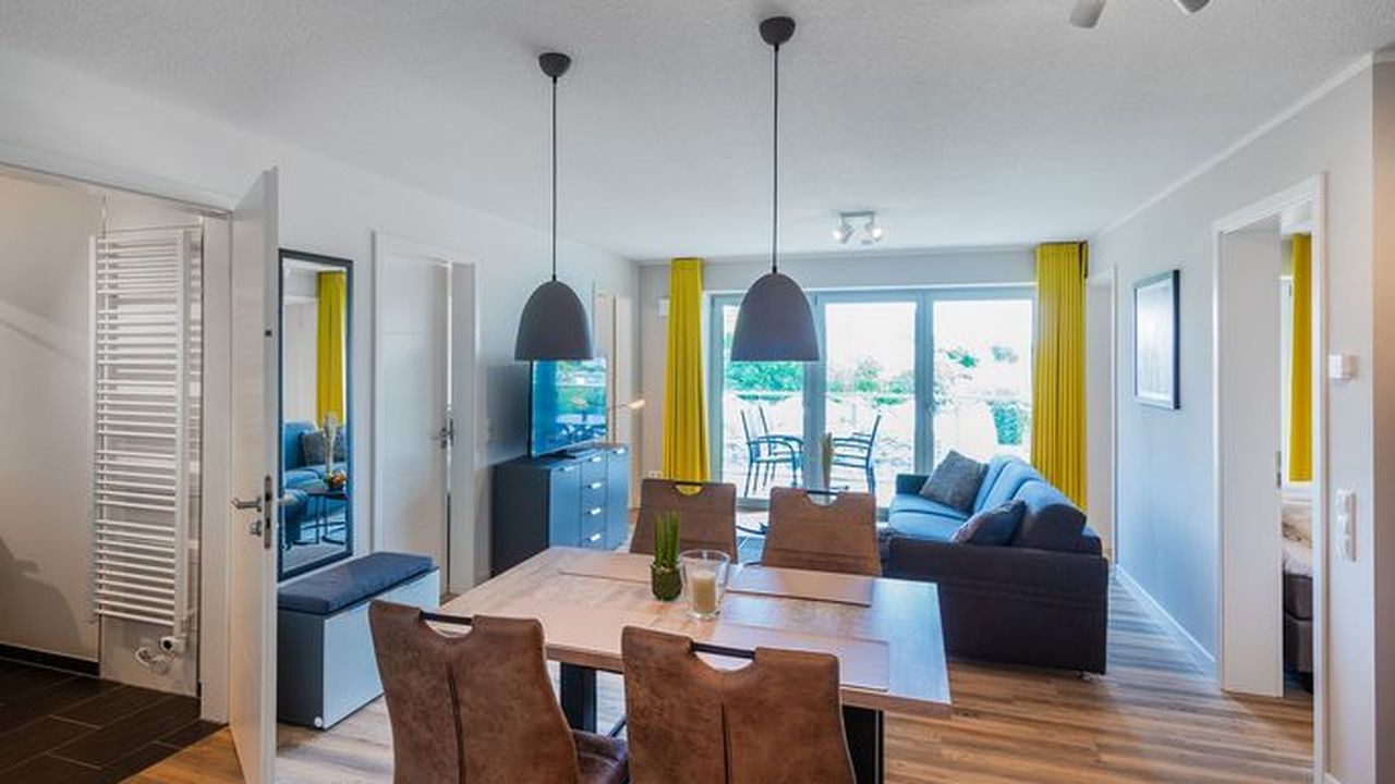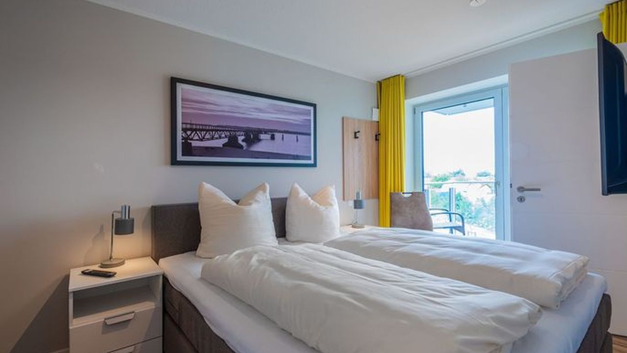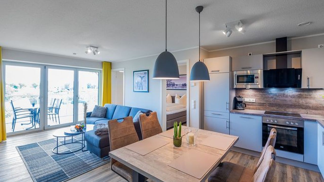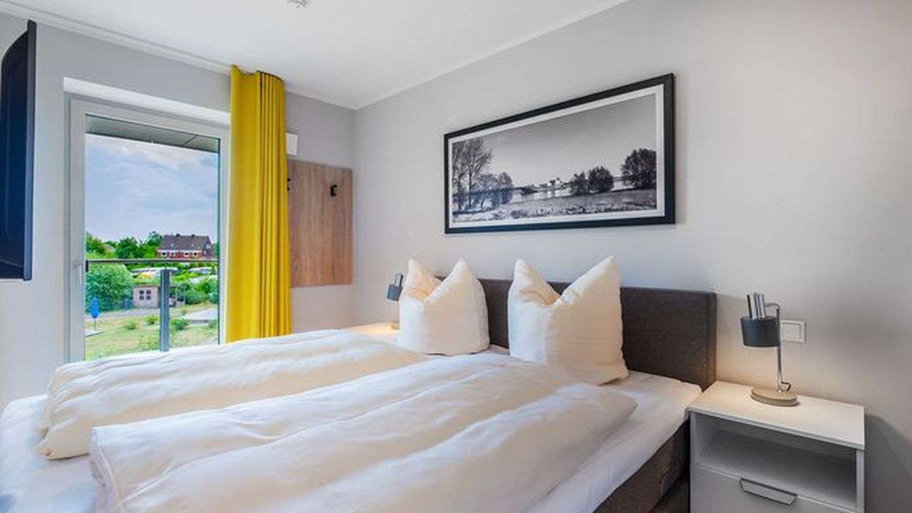 DIe Appartements der Kategorie D4 R3 in unserem Ferienhaus Elbbrise bieten Ihnen eine komfortable Ferienwohnung mit zwei separaten Schlafzimmern, einem offenen Wohn-, Koch- und Essbereich und einem Balkon mit Blick auf die Elbe.Ausstattung auf einen Blick: