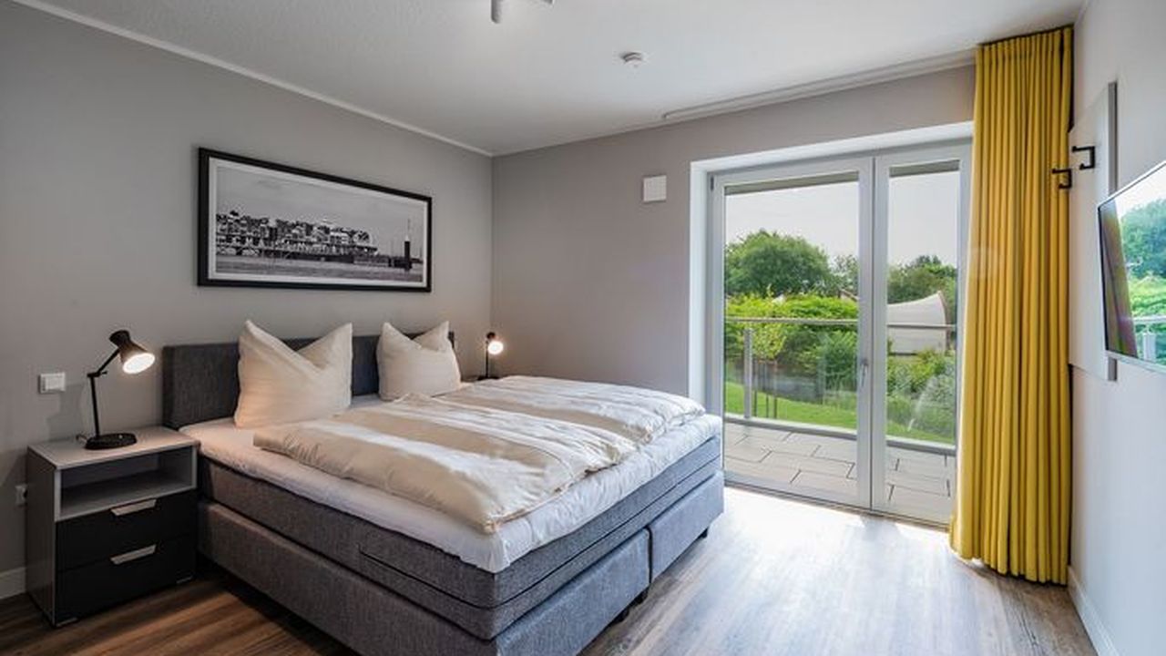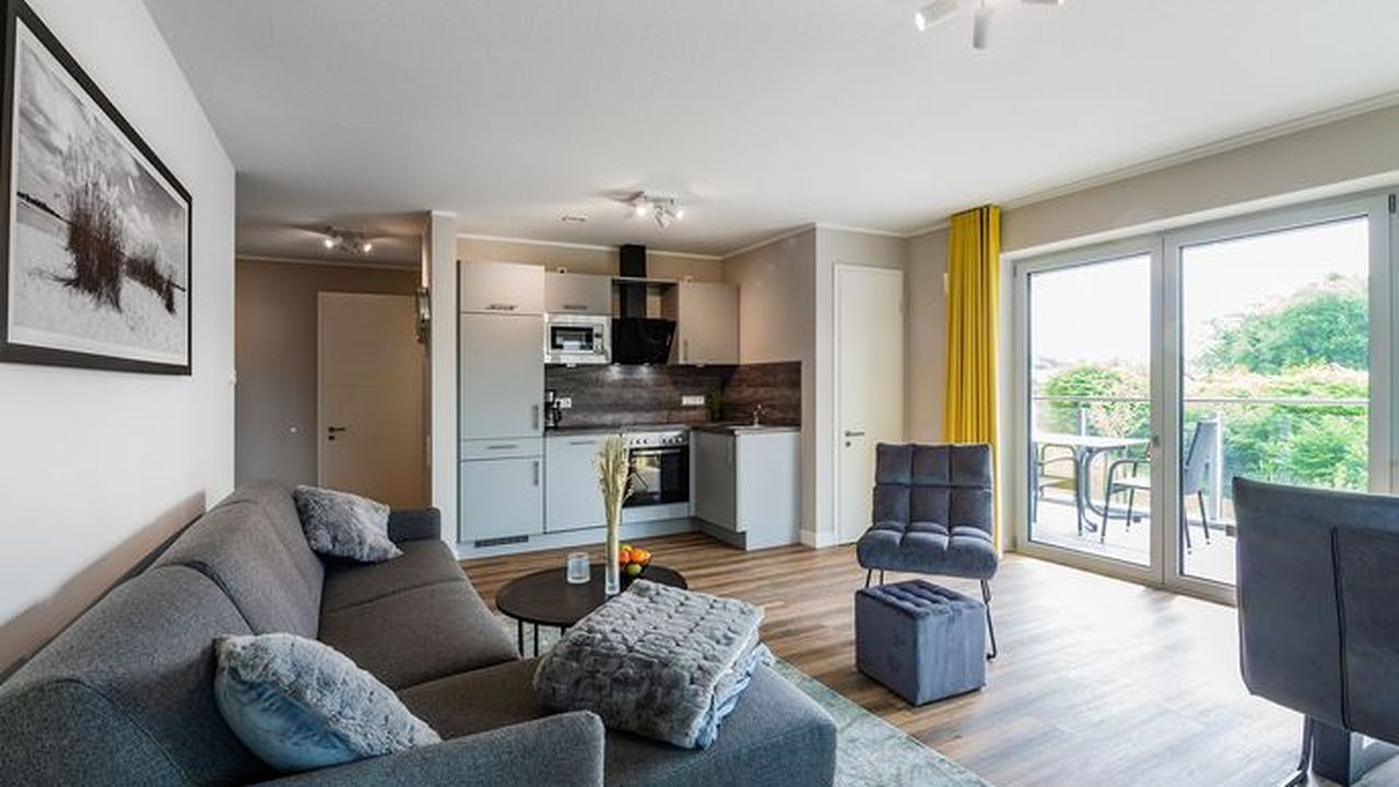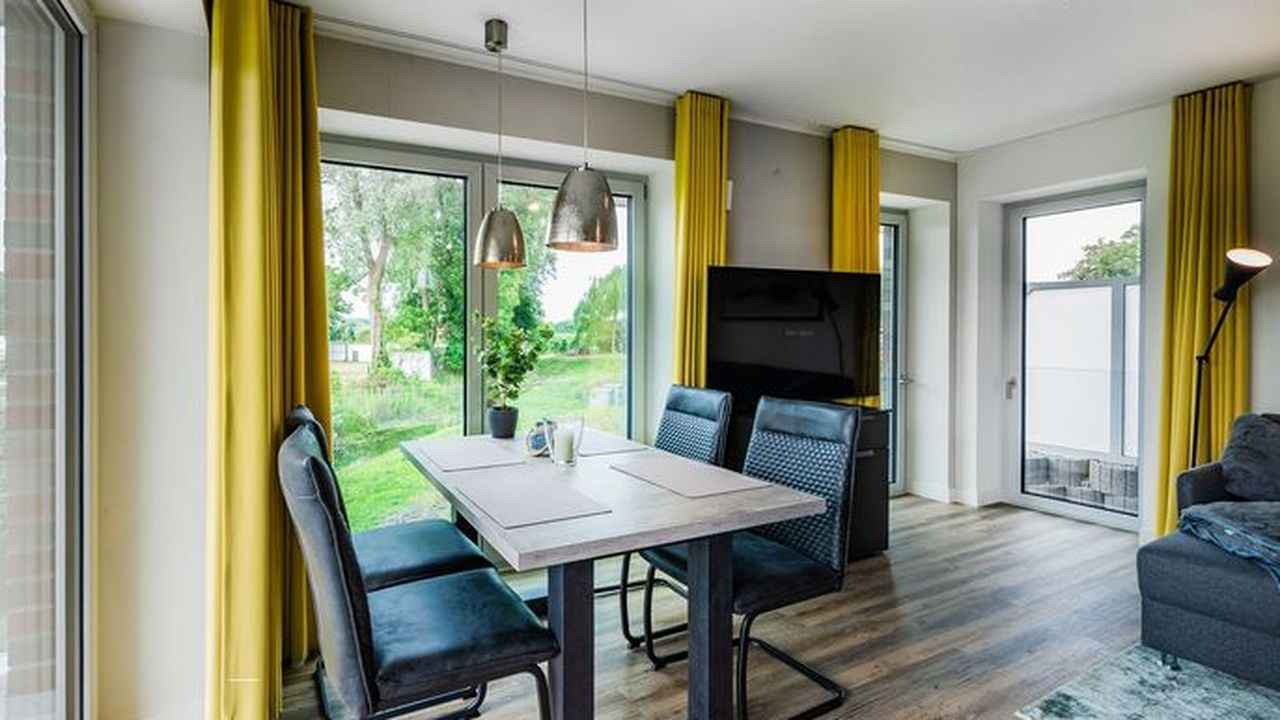 DIe Appartements der Kategorie D2 R2 in unserem Ferienhaus Elbbrise bieten Ihnen eine komfortable Ferienwohnung mit einem separaten Schlafzimmer, einem offenen Wohn-, Koch- und Essbereich und einem Landblick Balkon.Ausstattung auf einen Blick: